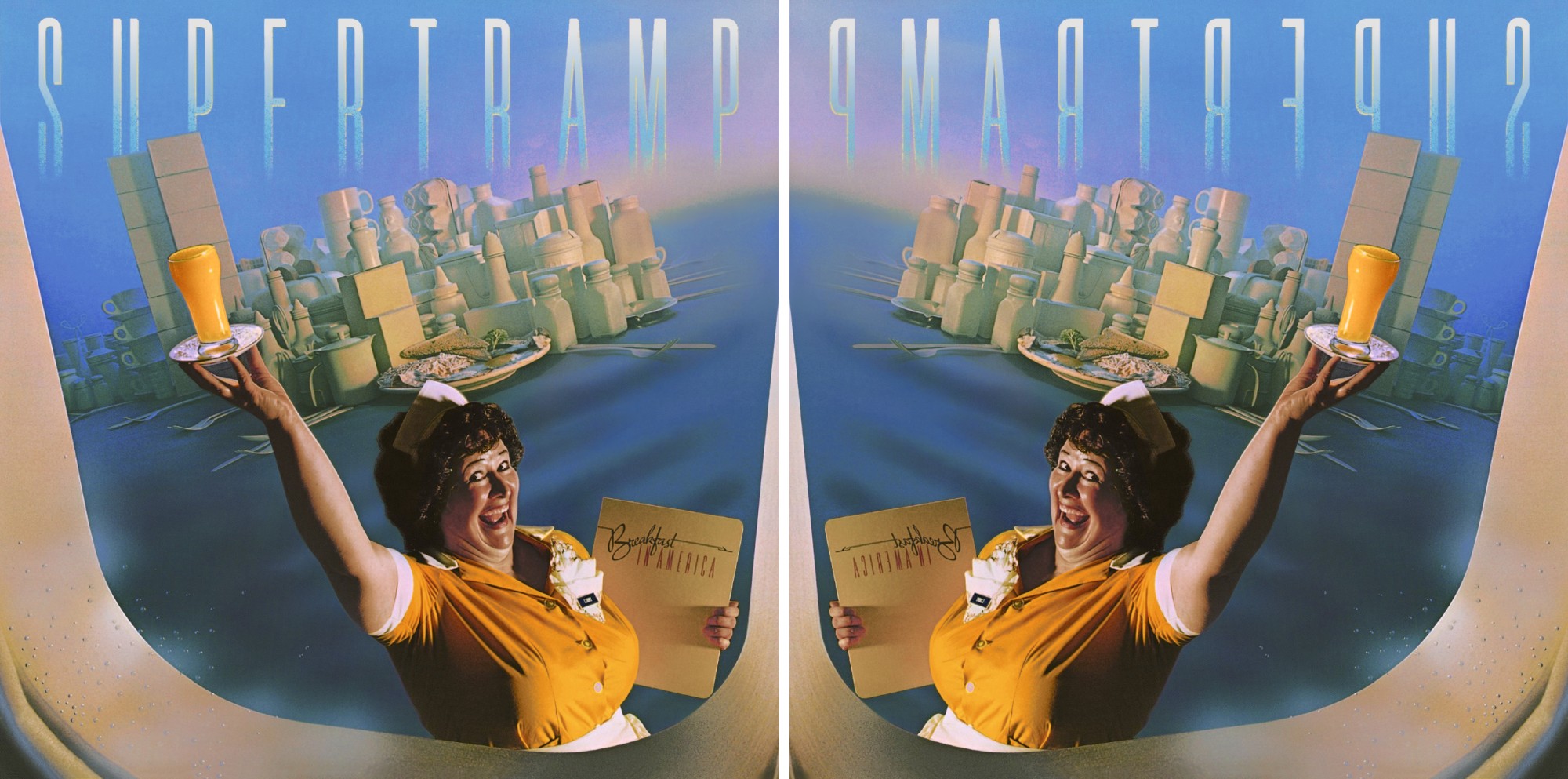 Zooming in on the letters "SUPERTRAMP" shows they are fading away towards the bottom, or crumbling, just like the Twin Towers crumbled in the end. The 9/11 Attacks happened early morning which coincides with the word "Breakfast". The word "Breakfast" on the menu resembles a weird detour of the plane, just like the planes hitting the towers. Perhaps the crash into the buildings could be a "fast break".