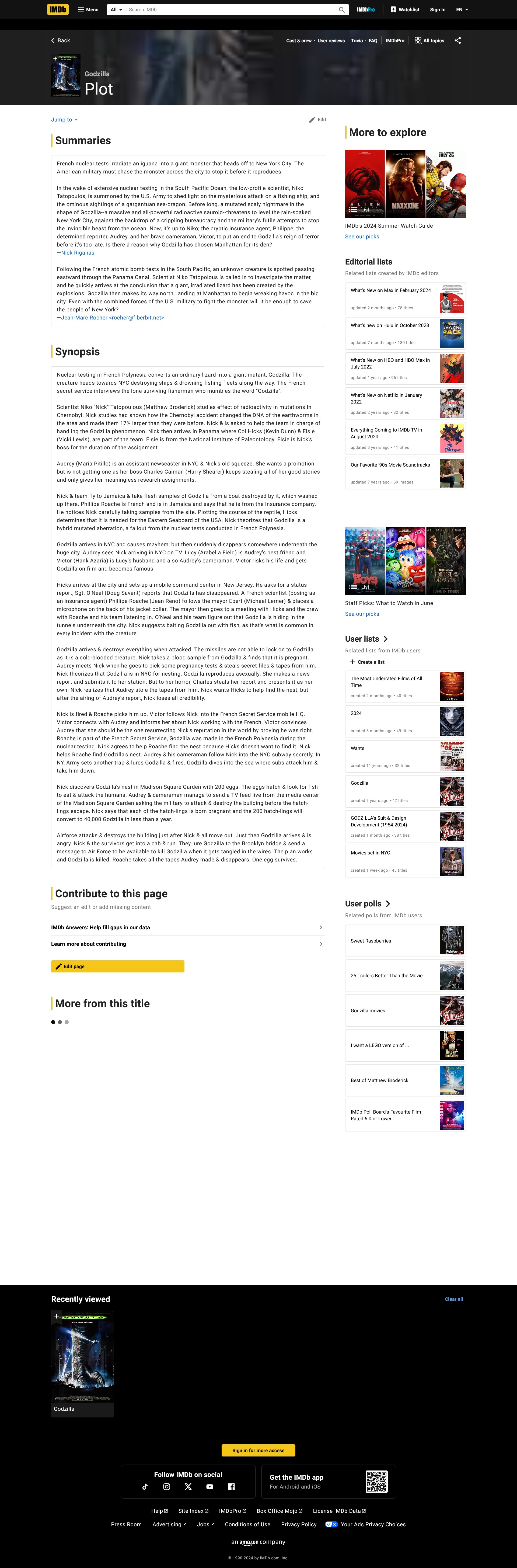 Following the French atomic bomb tests in the South Pacific, an unknown creature is spotted passing eastward through the Panama Canal. ... a giant, irradiated lizard has been created by the explosions. Godzilla then makes its way north, landing at Manhattan to begin wreaking havoc in the big city. Even with the combined forces of the U.S. military to fight the monster, will it be enough to save the people of New York?*