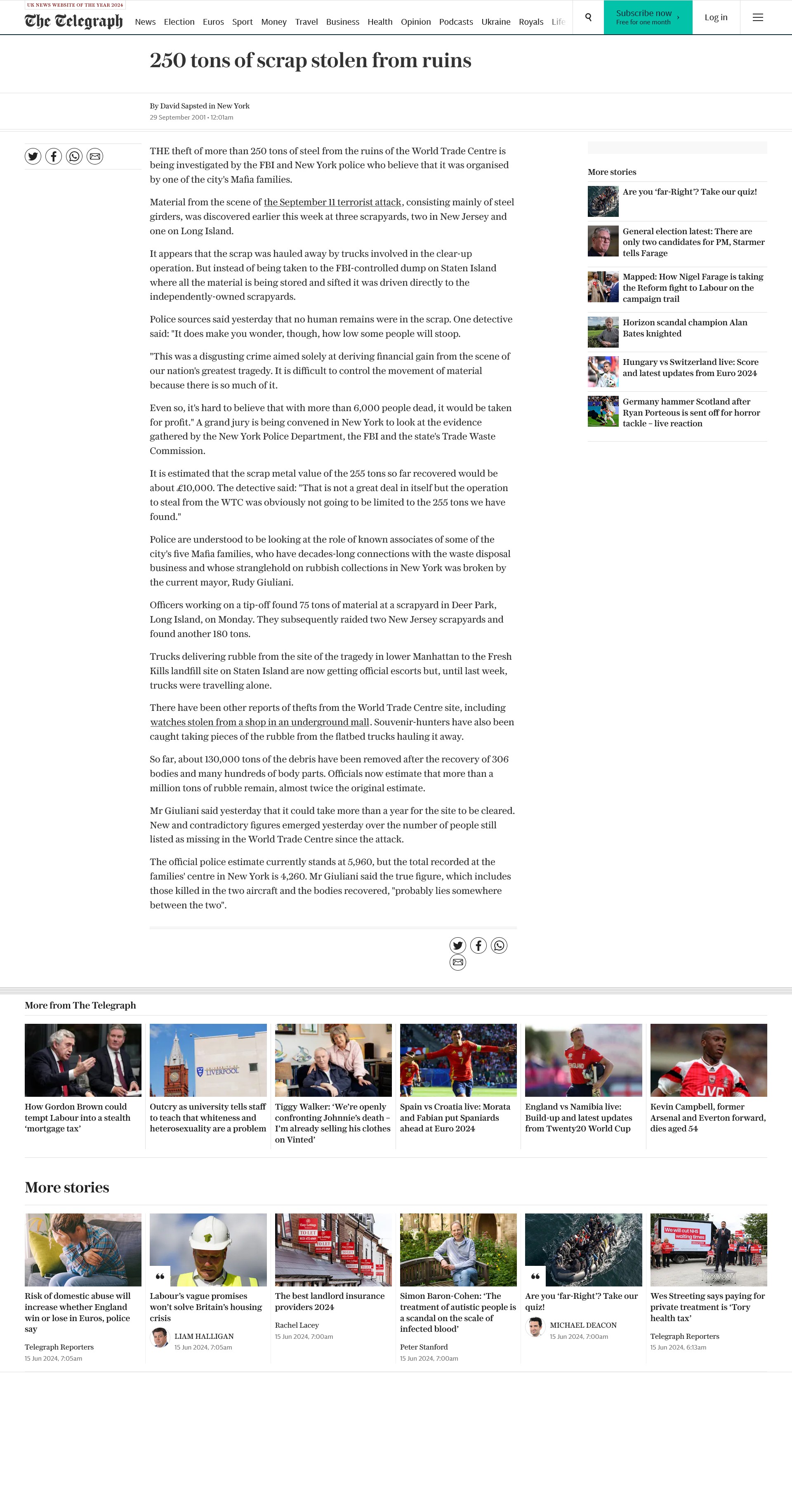 On 29 September news media reported:The theft of more than 250 tons of steel from the ruins of the World Trade Centre is being investigated by the FBI and New York police who believe that it was organised by one of the city's Mafia families.** 200,000 tons of steel in total were used in the construction of the WTC and shortly after the disaster 175,000 tons of steel were sold.* How convenient for the power elite that steel from Ground Zero was removed quickly so it could also not be thoroughly examined. Tampering with evidence is of course illegal under both federal and state law, but not to those who place themselves above the law. On 12 September New York mayor Rudy Giuliani gave a speech in which he said:We were able to move 120 dump trucks out of the city last night... More of it is being removed and it'll be done by barge all throughout the day today.**