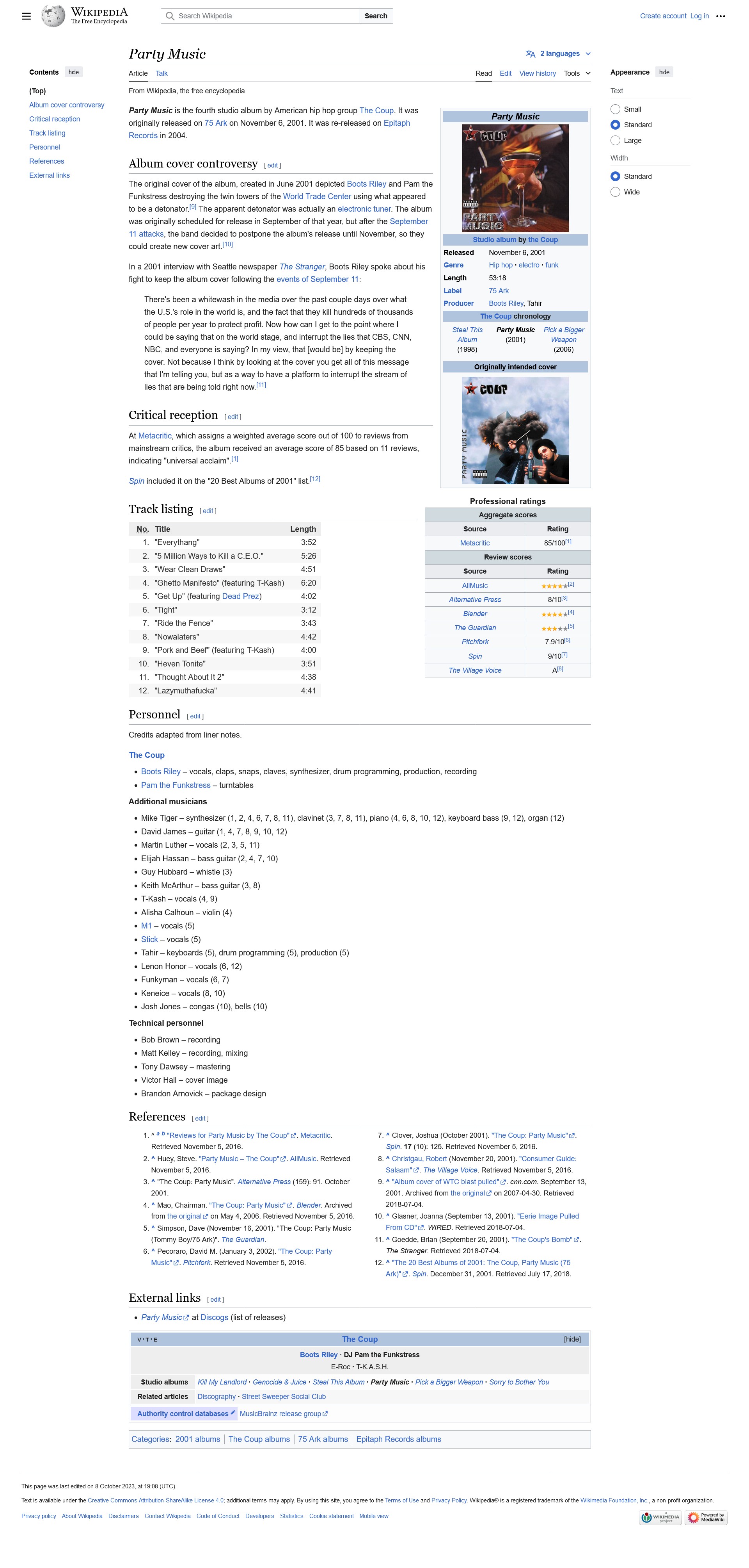 The Coup's album Party Music* was about to be released on 11 September 2001, the day the attacks took place, with a cover depicting the Twin Towers exploding. After the attacks they changed the cover artwork. But the explosions look strikingly similar to the explosions of the planes hitting the towers, at the same locations. And to be released on the exact day of the attacks?