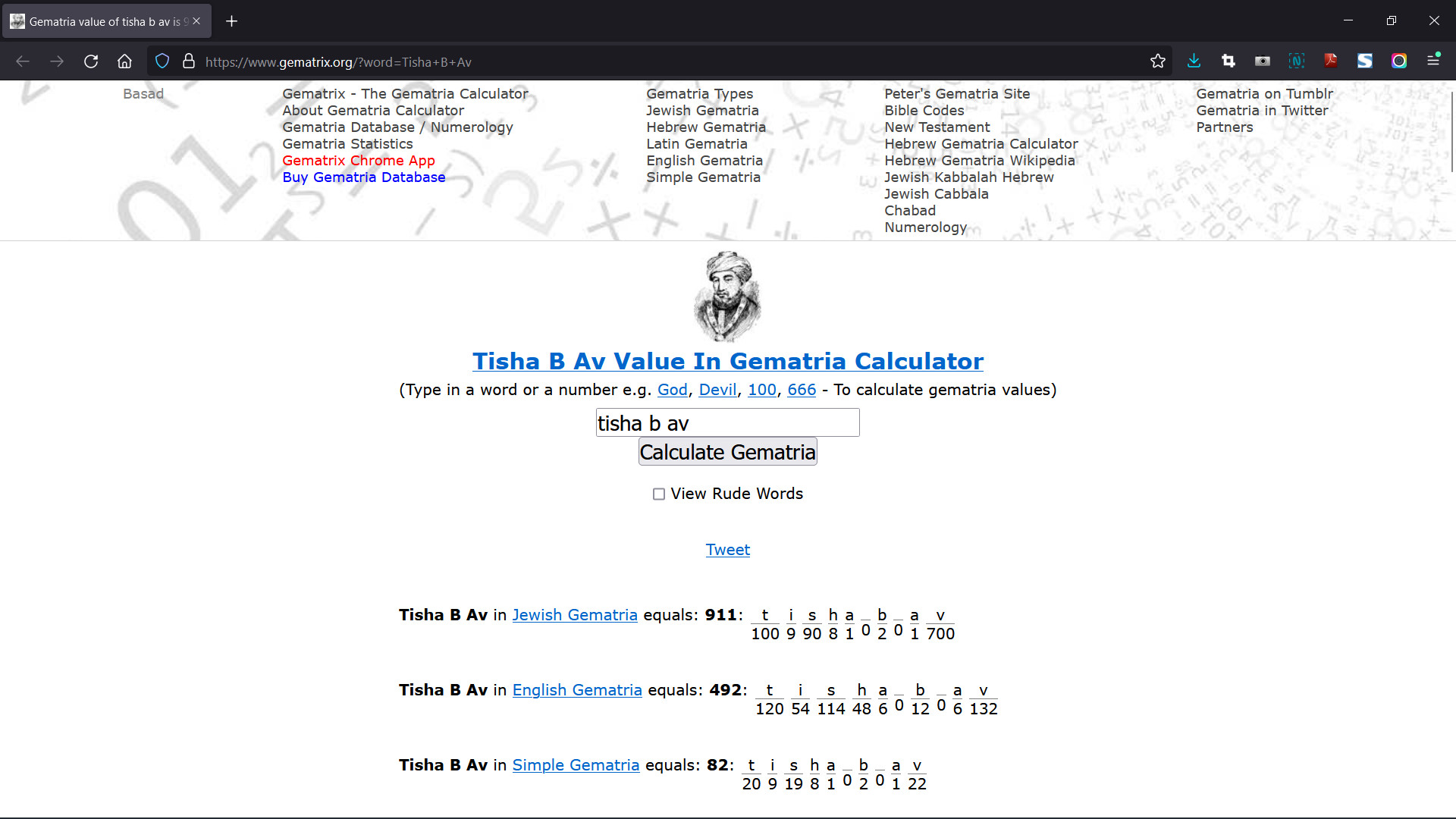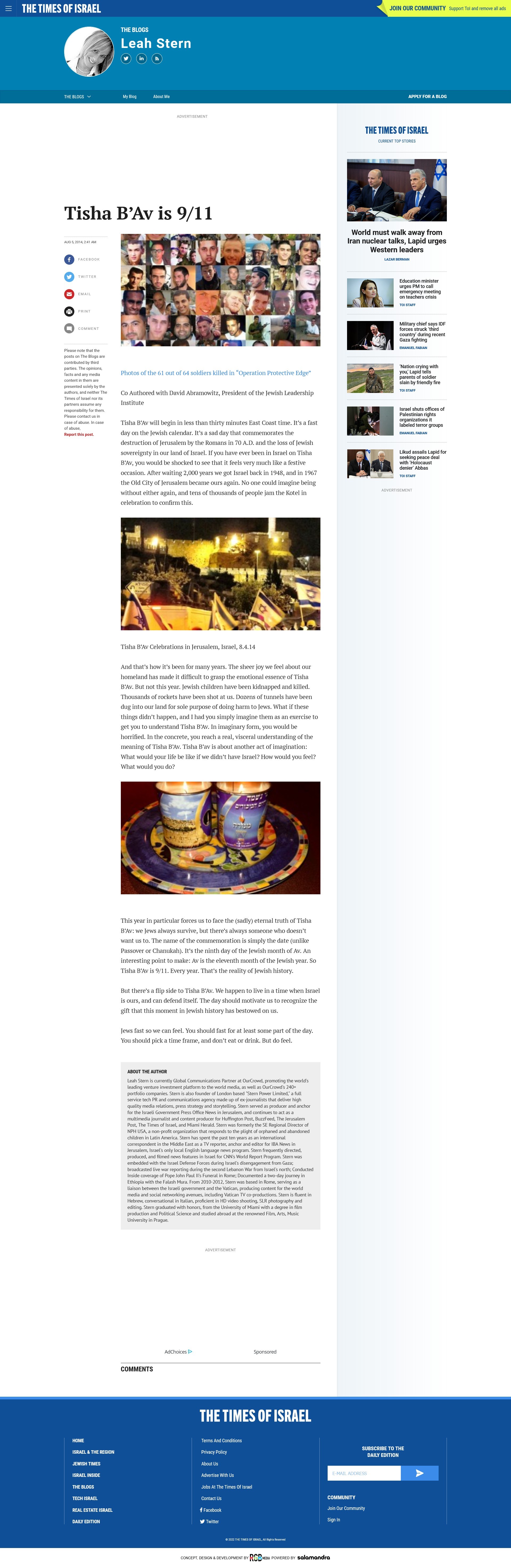 The Jewish Tisha B'Av happens on "the ninth of Av". Av is the 11th month of the civil year on the Hebrew calendar. Both Solomon's Temple and the Second Temple were destroyed on 9/11. In Jewish circles it is called "a day which is destined for tragedy". The combination "Tisha B Av" in Jewish gematria equals to "911"*. Jewish newspaper Times Of Israel headlines with Tisha B’Av is 9/11 ** in an article co-authored with David Abramowitz, President of the Jewish Leadership Institute, one of the many zionist organizations in the US. After the 9/11 Attacks Israeli PM Netanyahu said that these attacks were very beneficial to Israel. See 9/11 Attacks.