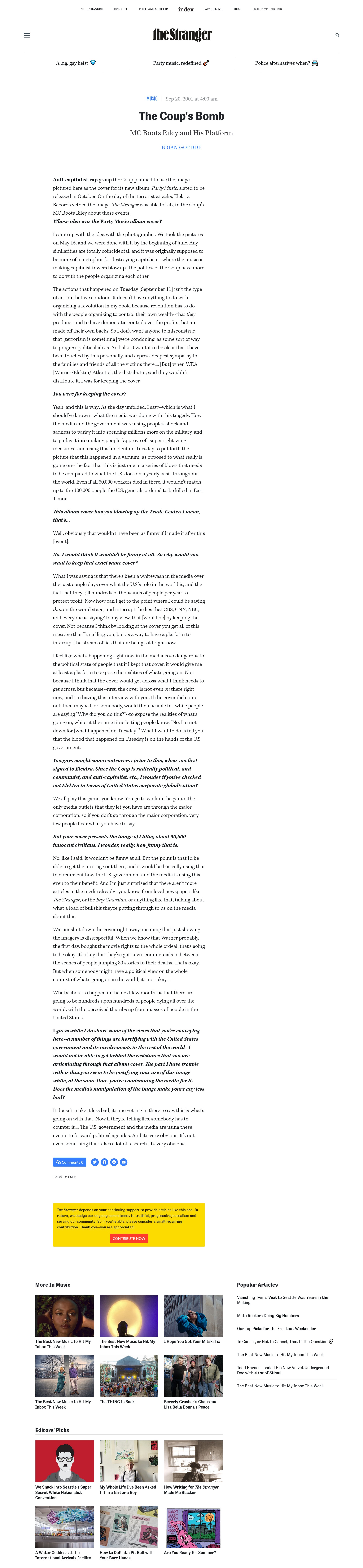This album cover is of a band named "The Coup". After the 9/11 attacks, in 2007, former US general Wesley Kanne Clark said:What happened with 9/11... We had a policy coup in this country. Some hardnosed people took over the direction of American policy and they never bothered to inform the rest of us.*