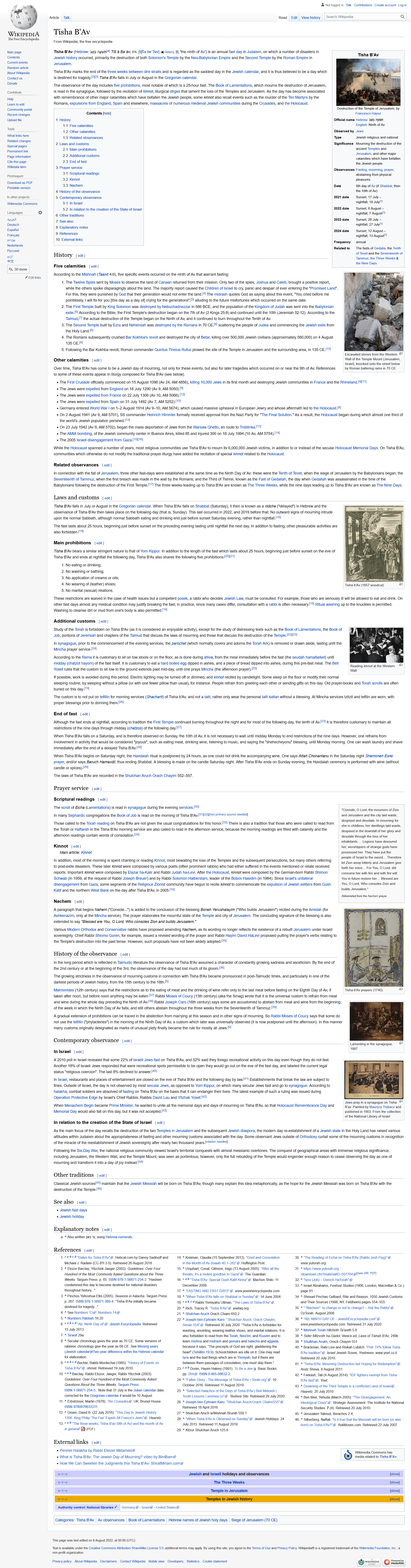 Tisha B'Av (... lit. "the ninth of Av") is an annual fast day in Judaism, on which a number of disasters in Jewish history occurred, primarily the destruction of both Solomon's Temple by the Neo-Babylonian Empire and the Second Temple by the Roman Empire in Jerusalem. Tisha B'Av marks the end of the three weeks between dire straits and is regarded as the saddest day in the Jewish calendar, and it is thus believed to be a day which is destined for tragedy.*