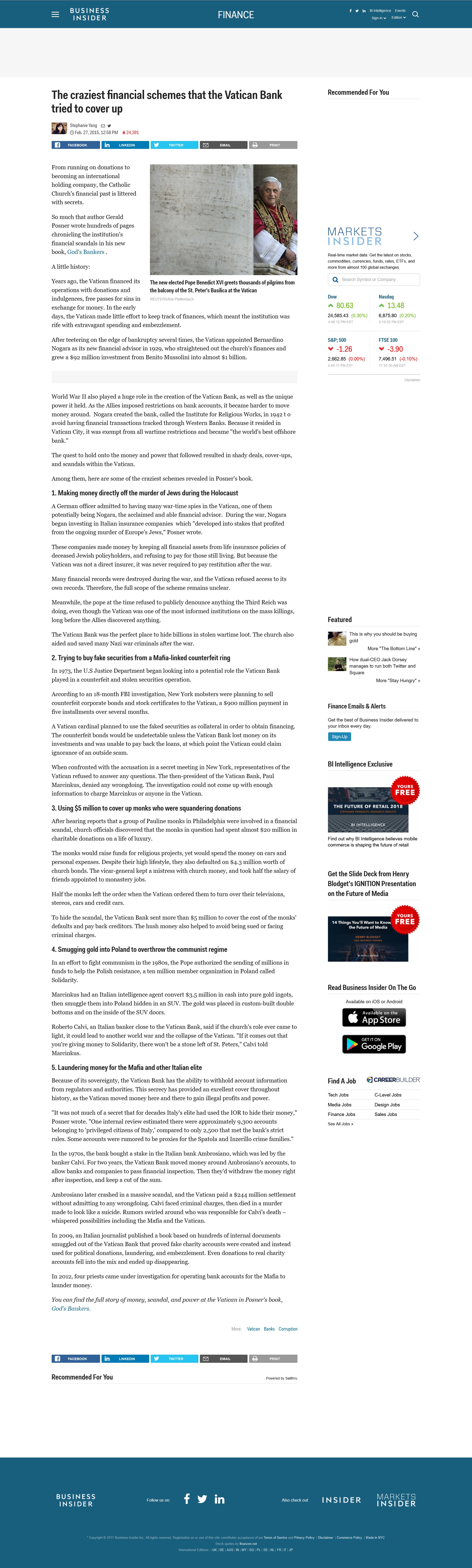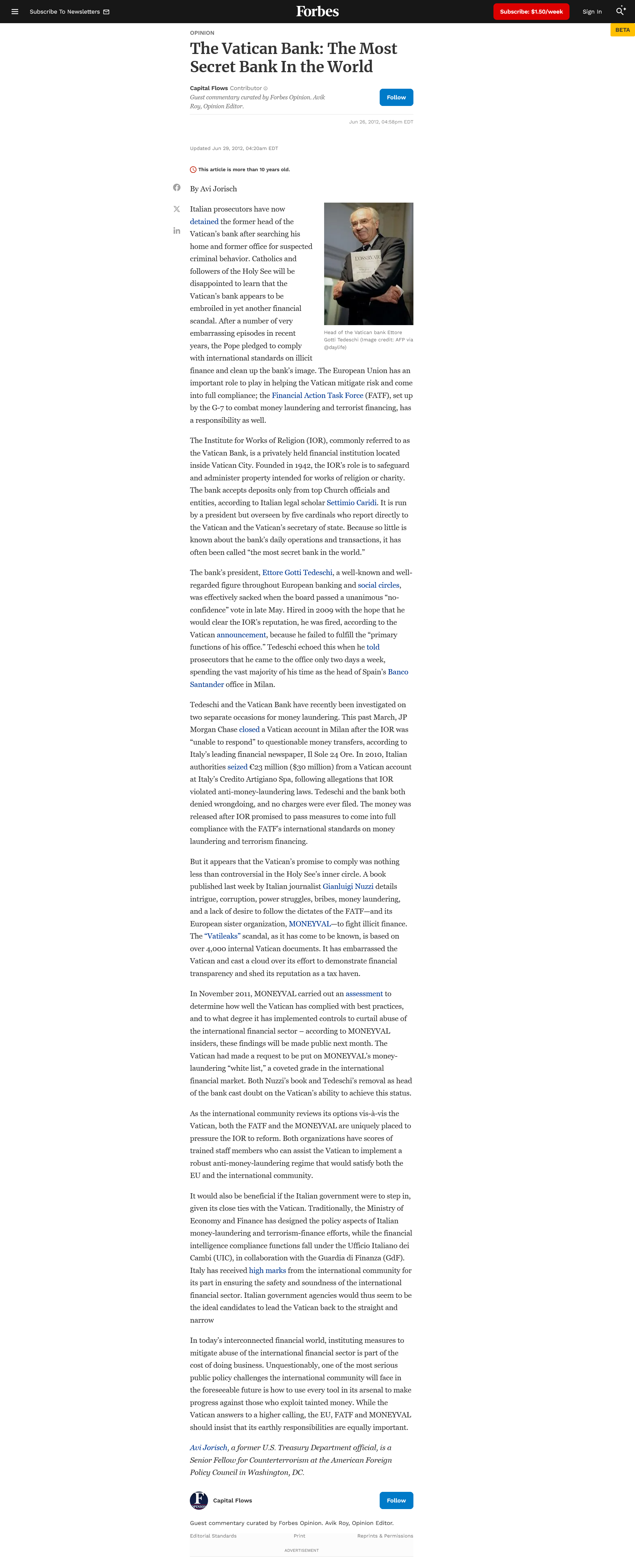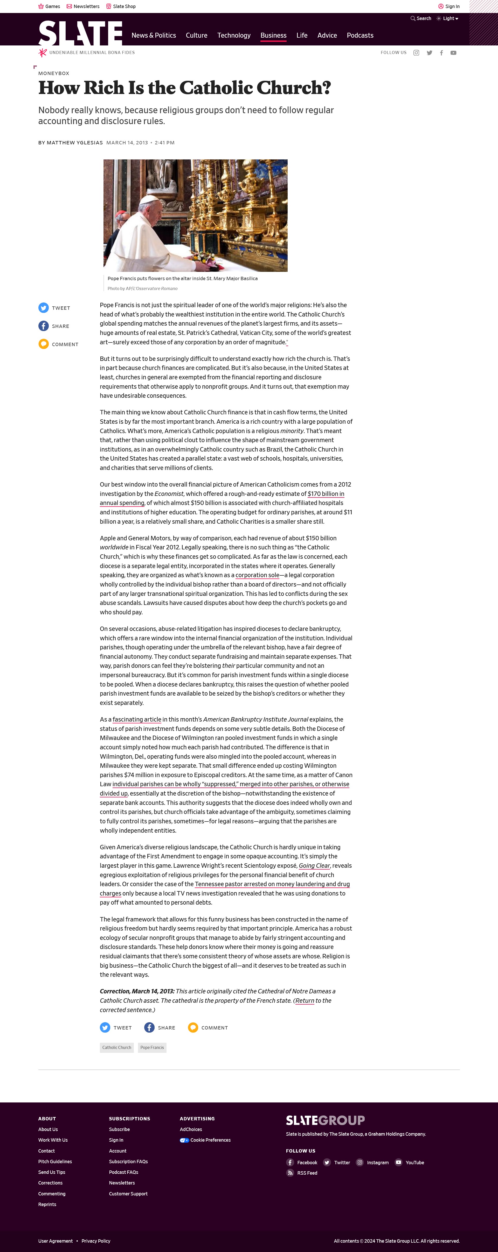 How Rich Is the Catholic Church? Nobody really knows, because religious groups don't need to follow regular accounting and disclosure rules.** In 2015 The Guardian reportedUntraceable cash transfers and a culture of secrecy made the Vatican bank one of the world's most notorious financial institutions.** Religious institutions are involved in tax evasion. To be rich the rest has to be relatively poor. The Vatican Bank is a privately held institute situated exclusively on the sovereign territory of the Vatican City and run by a Board of Superintendence which reports to a Supervisory Commission of Cardinals and the Pope.The Catholic Church's financial past is littered with secrets** and the Vatican Bank issteeped in mystery** and labeled theMost Secret Bank In the World**. Secrecy is linked to corruption.
