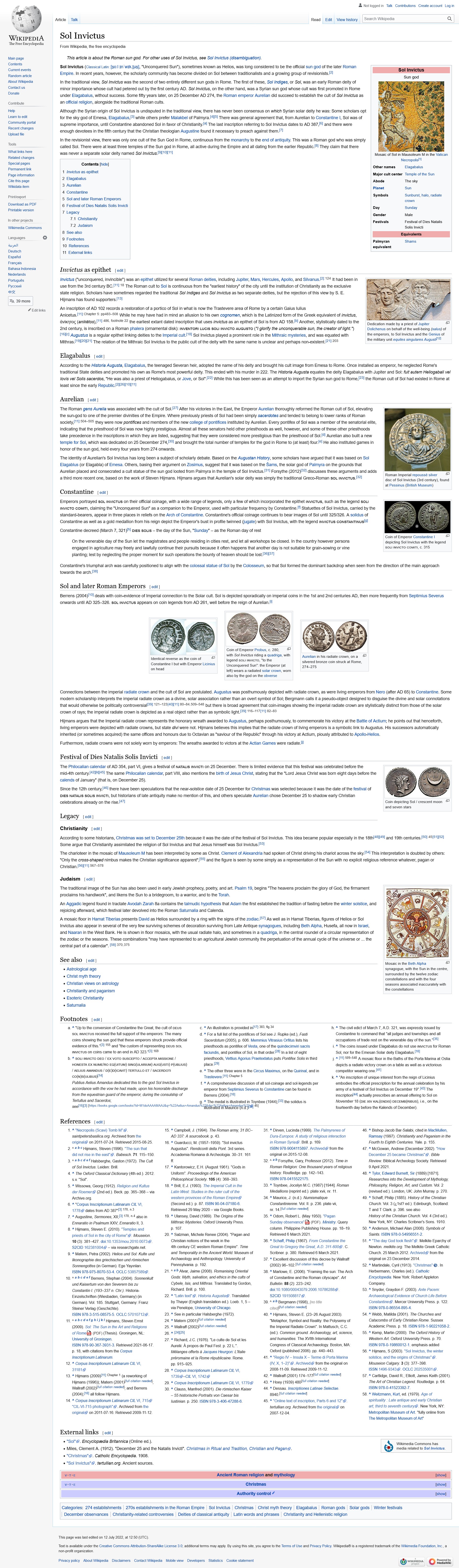 During the later periods of Roman history, sun worship gained in importance and ultimately led to what has been called a "solar monotheism." Nearly all the gods of the period were possessed of solar qualities, and both Christ and Mithra acquired the traits of solar deities. The feast of Sol Invictus (Unconquered Sun) on December 25 was celebrated with great joy, and eventually this date was taken over by the Christians as Christmas, the birthday of Christ.*