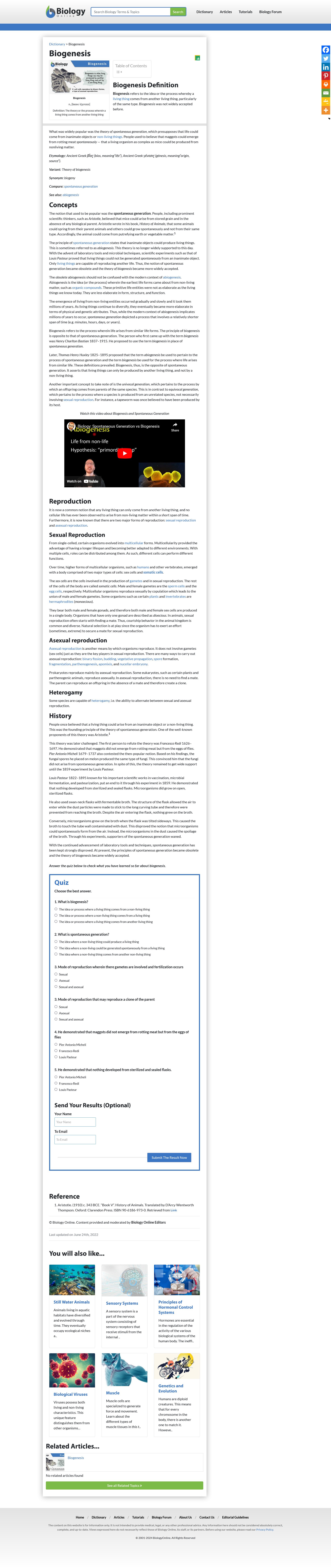 Biogenesis refers to the idea or the process whereby a living thing comes from another living thing, particularly of the same type. Biogenesis was not widely accepted before. The notion that used to be popular was the spontaneous generation. ... that inanimate objects could produce living things. This is sometimes referred to as abiogenesis. This theory is no longer widely supported to this day. With the advent of laboratory tools and microbial techniques, scientific experiments such as that of Louis Pasteur proved that living things could not be generated spontaneously from an inanimate object. Only living things are capable of reproducing another life. Thus, the notion of spontaneous generation became obsolete and the theory of biogenesis became more widely accepted.*