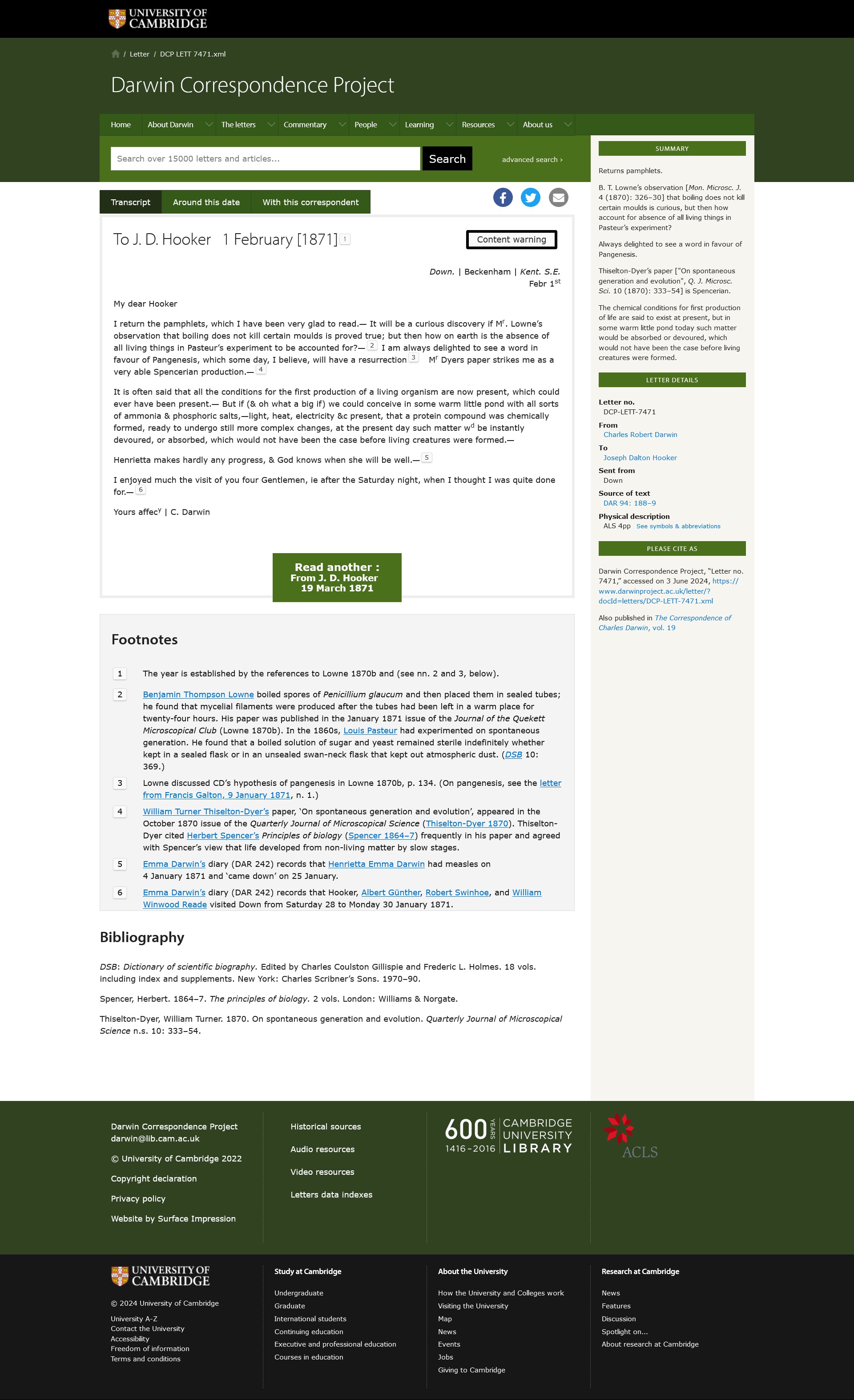 Charles Darwin - Letter to J. D. Hooker (1 February, 1871)