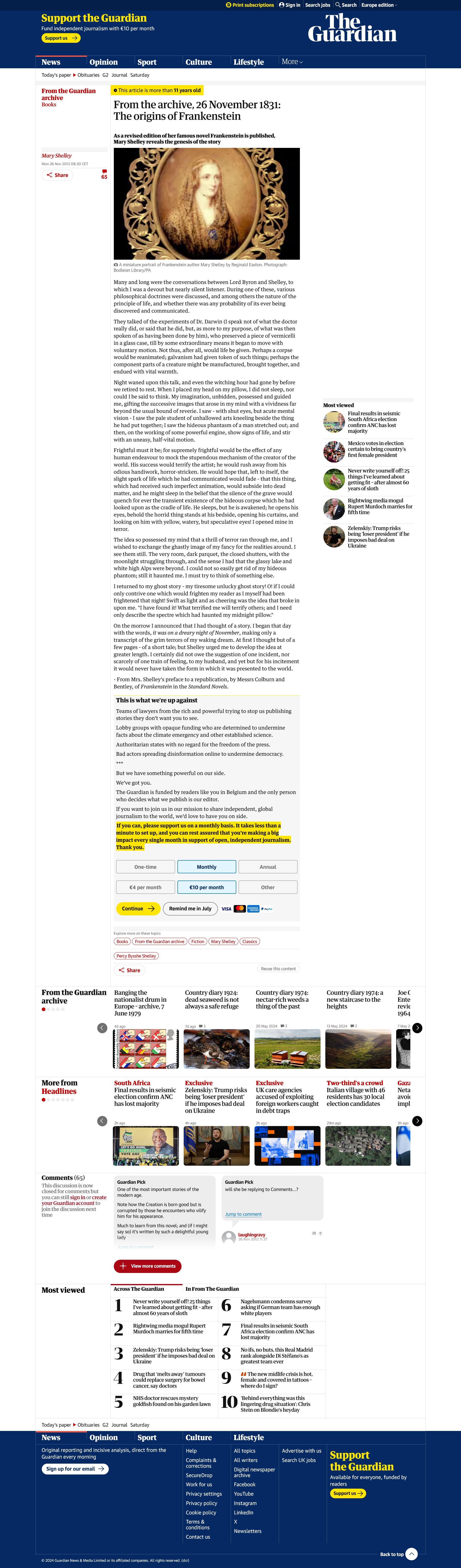 Many and long were the conversations between Lord Byron and Shelley, to which I was a devout but nearly silent listener. During one of these, various philosophical doctrines were discussed, and among others the nature of the principle of life, and whether there was any probability of its ever being discovered and communicated. They talked of the experiments of Dr. Darwin, ... who preserved a piece of vermicelli in a glass case, till by some extraordinary means it began to move with voluntary motion. Not thus, after all, would life be given. Perhaps a corpse would be re-animated; galvanism had given token of such things: perhaps the component parts of a creature might be manufactured, brought together, and endured with vital warmth.**