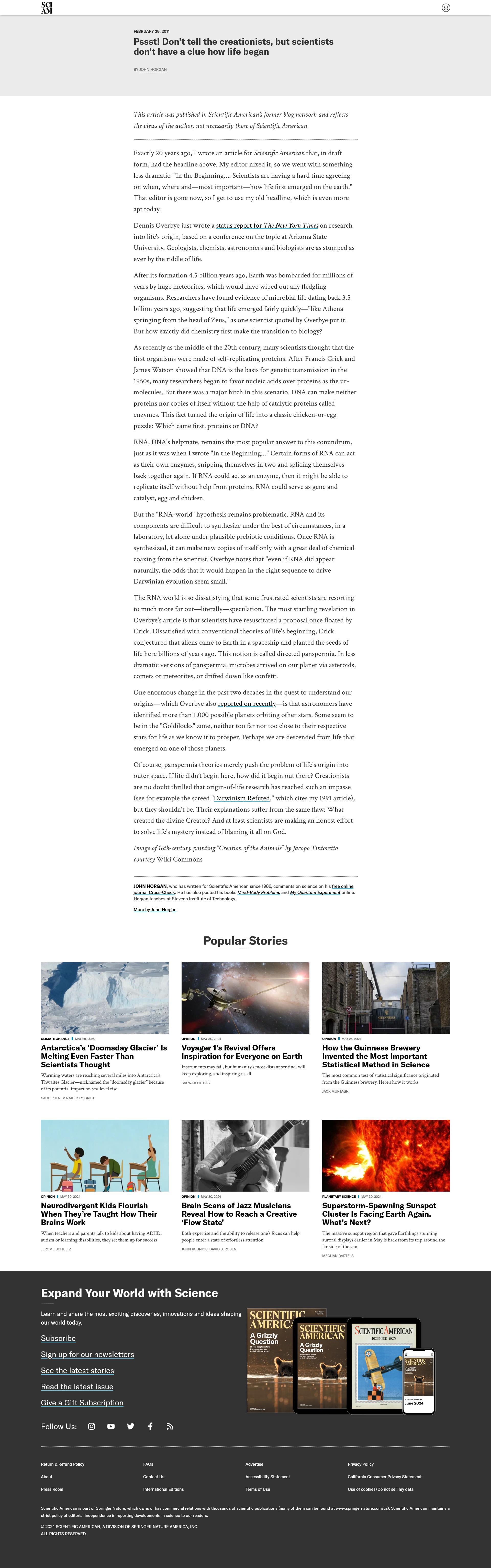 The more we know about the specified complexity of life by means of true science, the greater the miracle of life becomes. And miracles don't happen naturally. Because of this fact scientists like Fred Hoyle and Chandra Wickramasinghe wrote thatit becomes sensible to think that the favorable properties of physics on which life depends are in every respect deliberate.* They went on to mentionhigher intelligencesas the most likely cause. This has even led people to search for intelligent life elsewhere in the universe, a theory called panspermia. Steven A. Benner said:we went looking on Mars because the origins-of-life options on earth just aren't looking very good.**