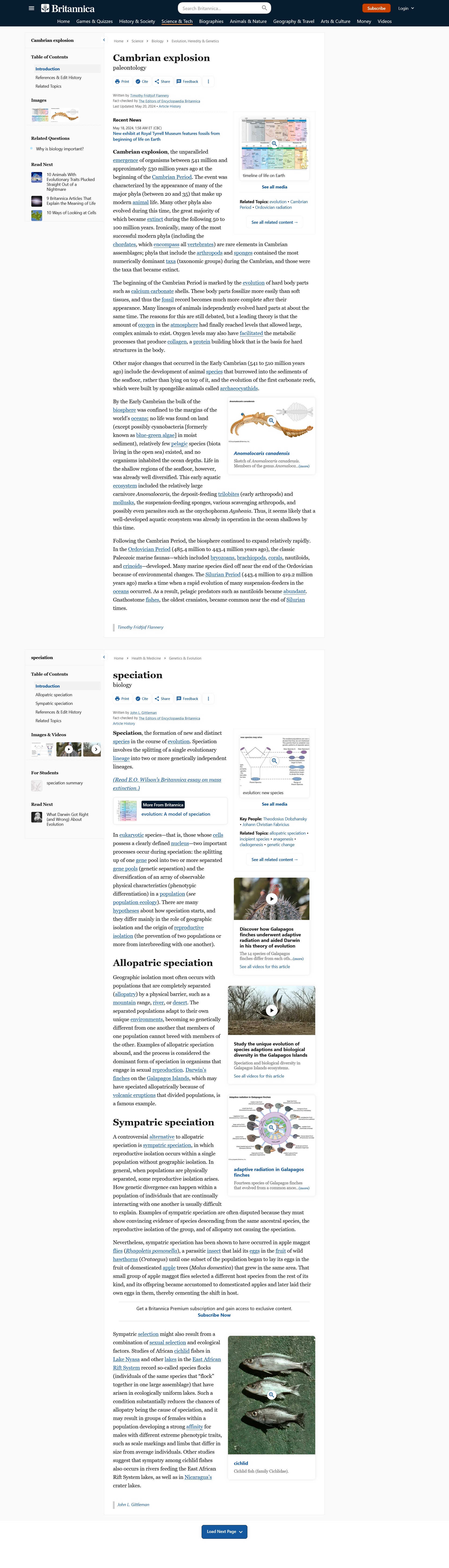 Cambrian explosion, the unparalleled emergence of organisms between 541 million and approximately 530 million years ago at the beginning of the Cambrian Period. The event was characterized by the appearance of many of the major phyla (between 20 and 35) that make up modern animal life. ... By the Early Cambrian the bulk of the biosphere was confined to the margins of the world’s oceans; no life was found on land.*