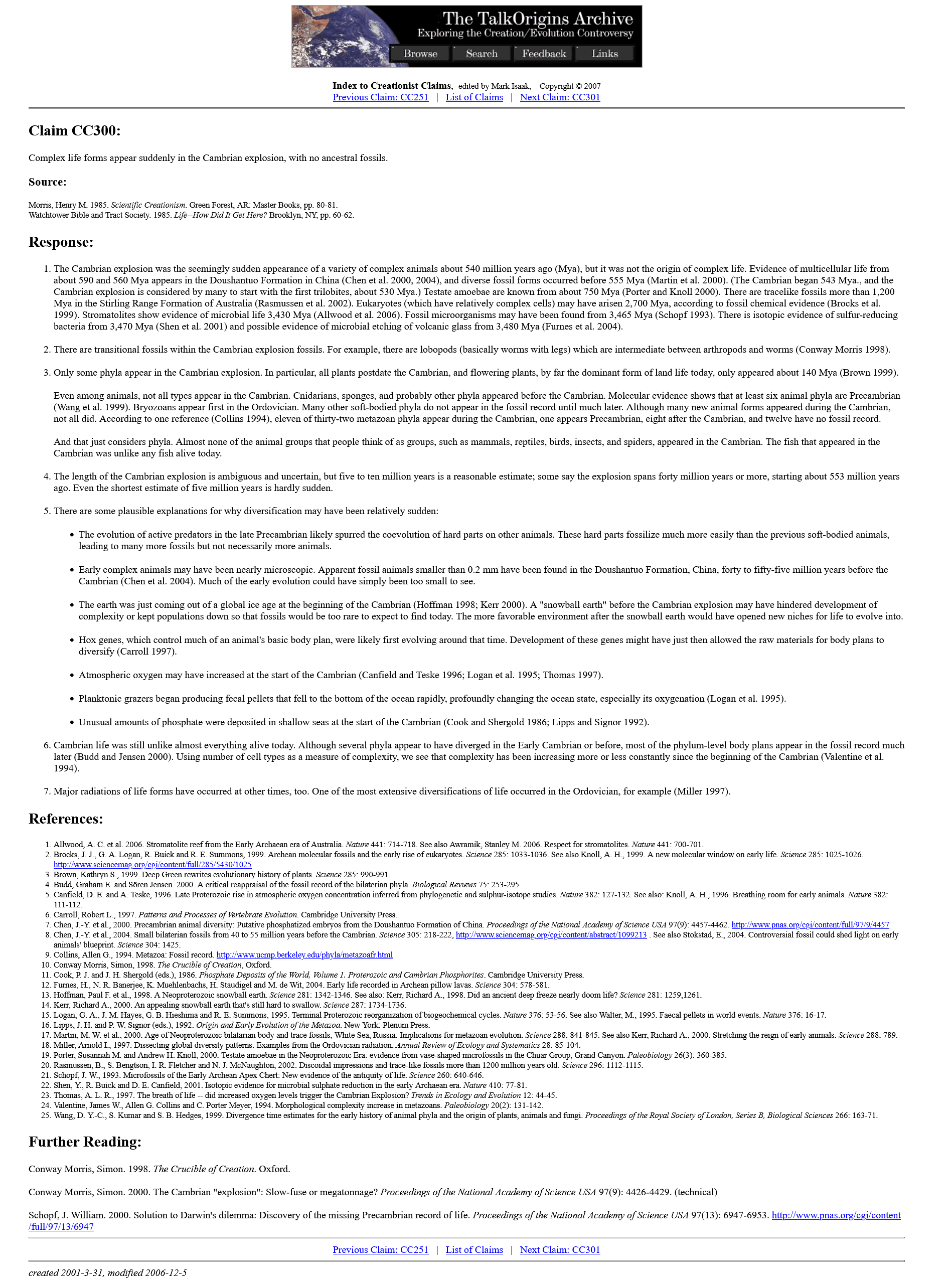 TalkOrigins - Claim CC300: Complex life forms appear suddenly in the Cambrian explosion, with no ancestral fossils.