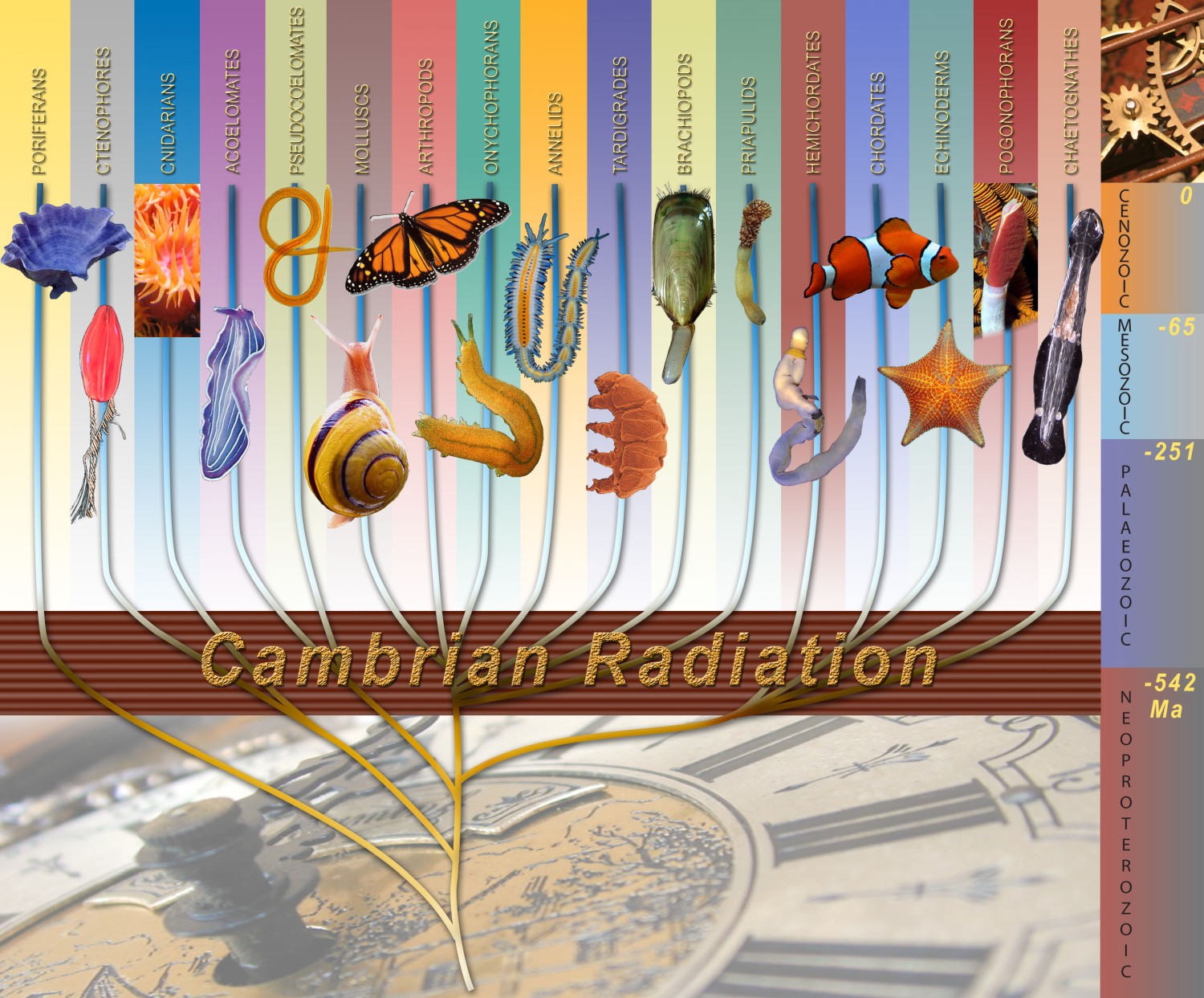 The fossils from the Cambrian period can cause a real headache for evolutionary biologists. Instinct tells us to expect simple organisms evolving over time to become increasingly more complex. However during the Cambrian period there was an apparent explosion of different major groups of animals, all appearing simultaneously in the fossil record.*