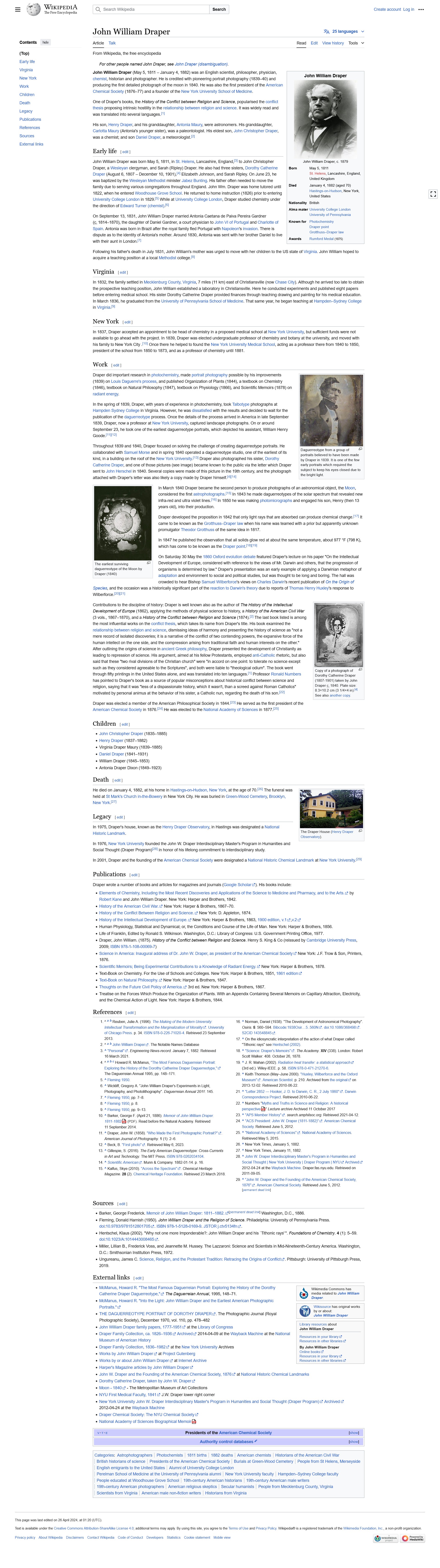 John William Draper was an English-born American scientist, philosopher, physician, chemist, historian and photographer. ... He was also the first president of the American Chemical Society (1876–77) and a founder of the New York University School of Medicine. One of Draper's books, the History of the Conflict between Religion and Science, popularised the conflict thesis proposing intrinsic hostility in the relationship between religion and science.*