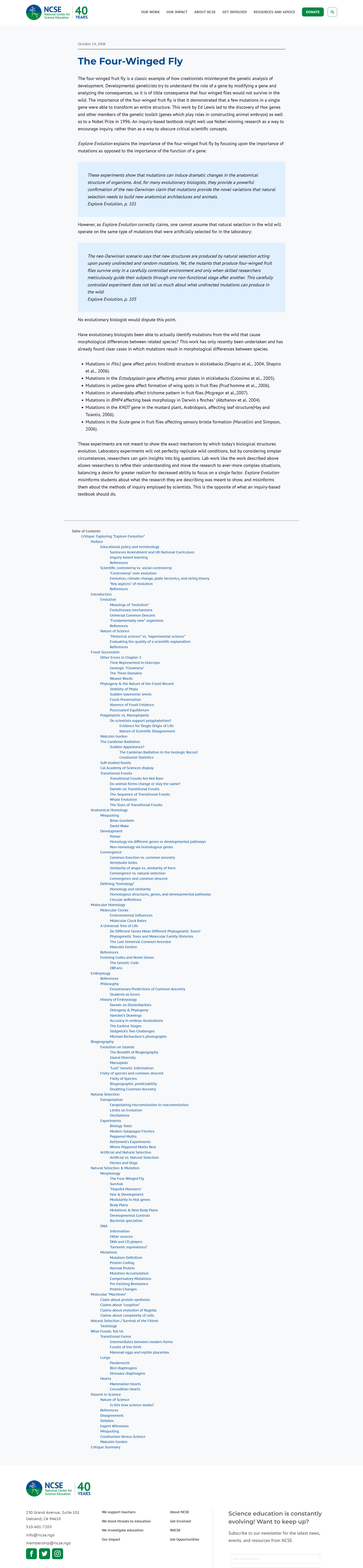 The neo-Darwinian scenario says that new structures are produced by natural selection acting upon purely undirected and random mutations. Yet, the mutants that produce four-winged fruit flies survive only in a carefully controlled environment and only when skilled researchers meticulously guide their subjects through one non-functional stage after another. This carefully controlled experiment does not tell us much about what undirected mutations can produce in the wild.