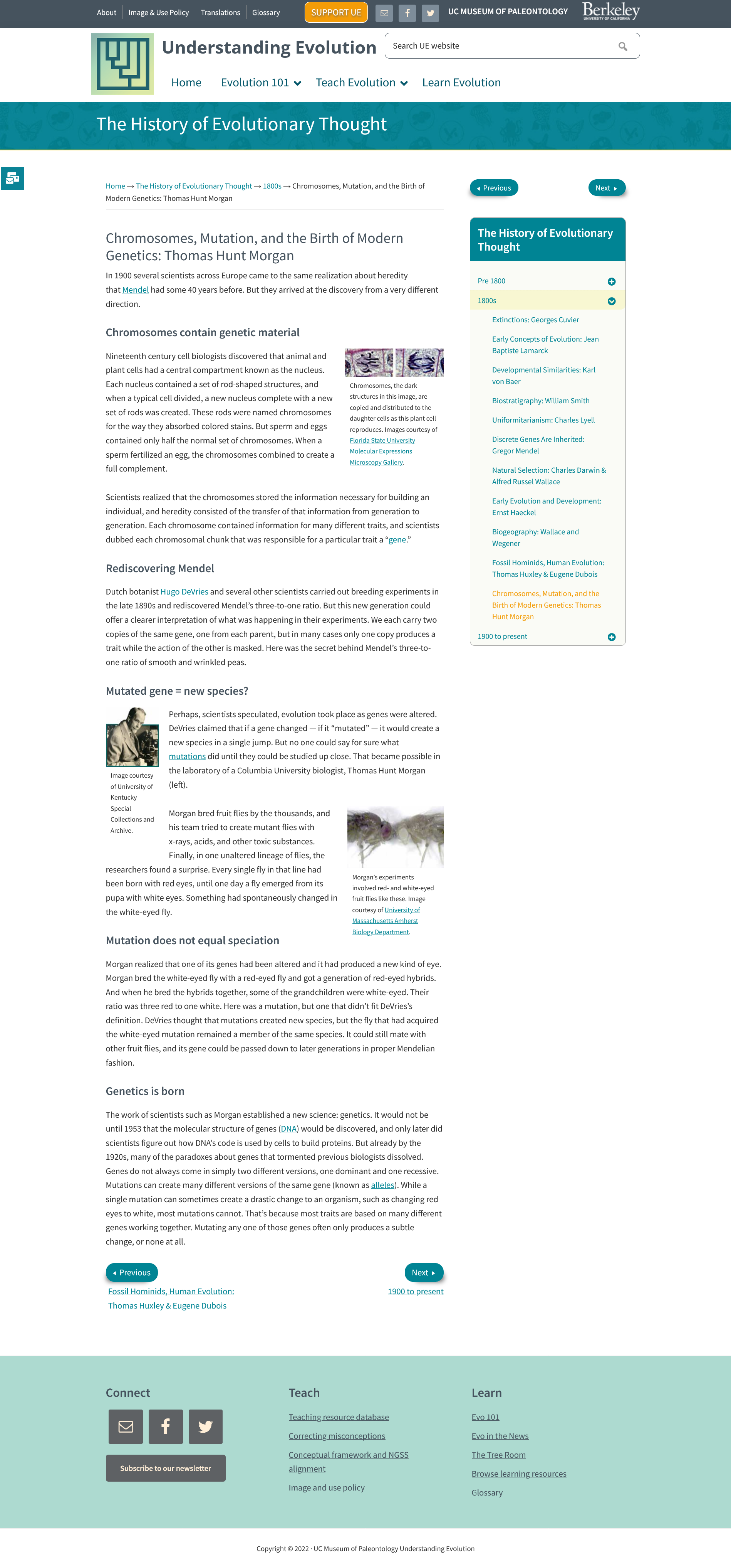 Perhaps, scientists speculated, evolution took place as genes were altered. DeVries claimed that if a gene changed - if it "mutated" - it would create a new species in a single jump.*