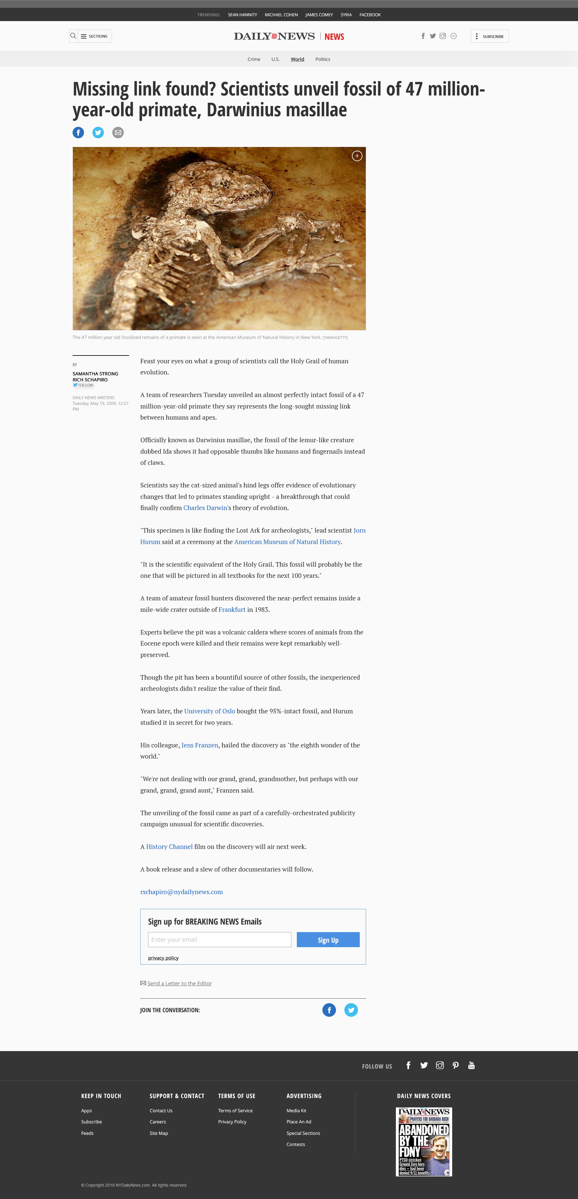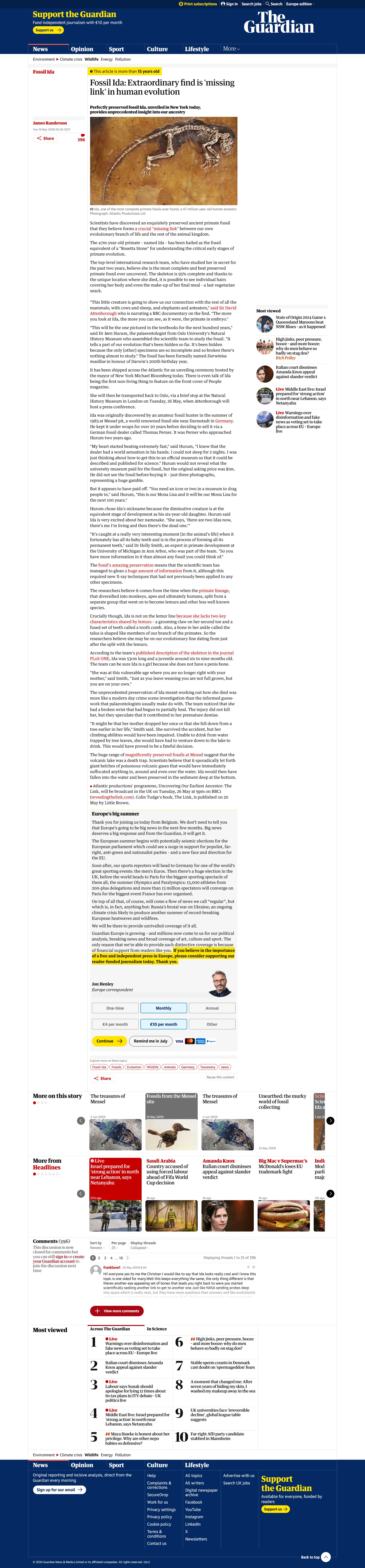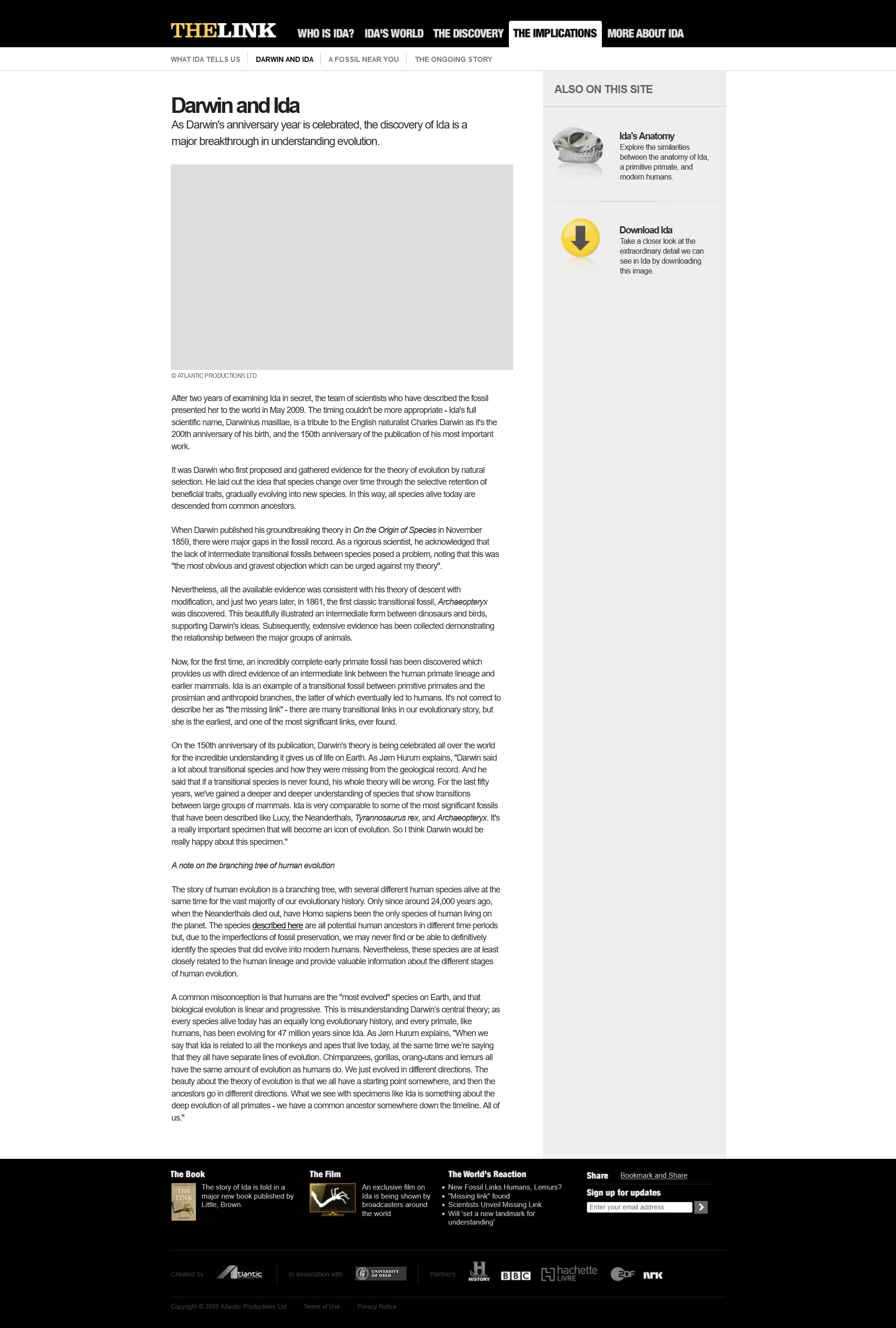 Ida's debut to the world was comprised of an astonishingly slick, multi-component media package—certainly the first of its kind. In addition to the press conference itself, Little, Brown, and Company released The Link: Uncovering Our Earliest Ancestor, by Colin Tudge on Tuesday; a multimedia-rich website, RevealingTheLink.com, was launched; and a two-hour documentary will air on the History Channel, the BBC, and various stations in Germany and Norway next week. And for the first time in the History Channel's history, their television programming is timed with the release of a scientific paper: The paper published on Monday by Hurum's team in the open-source journal, PLoS ONE. While the scientific community is just beginning to determine Ida's significance on the evolutionary spectrum, her place in the zeitgeist is secured. ... Hurum wanted to subvert the system and take his story straight to the masses in a way that would appeal to the average person, especially kids.*