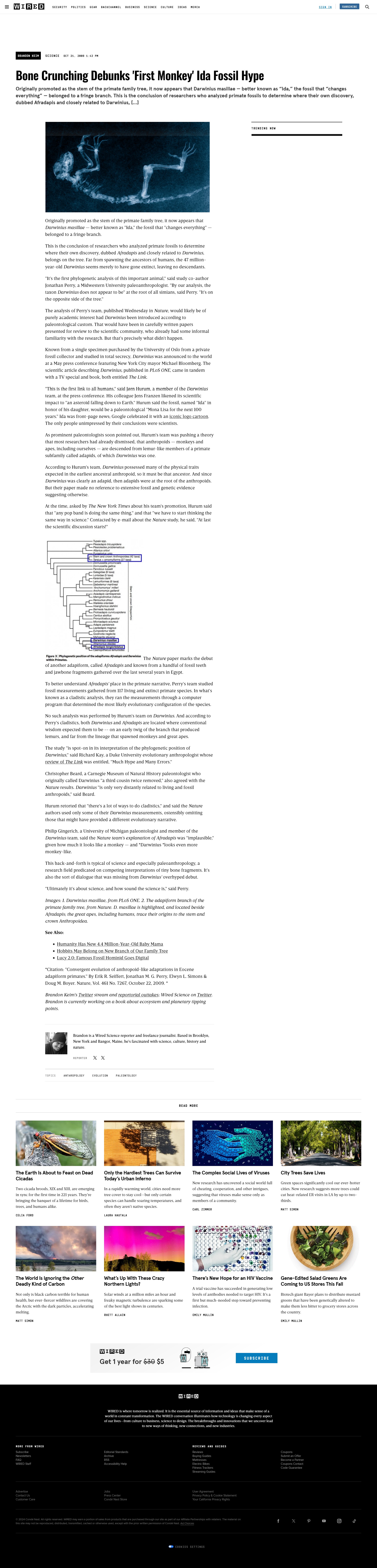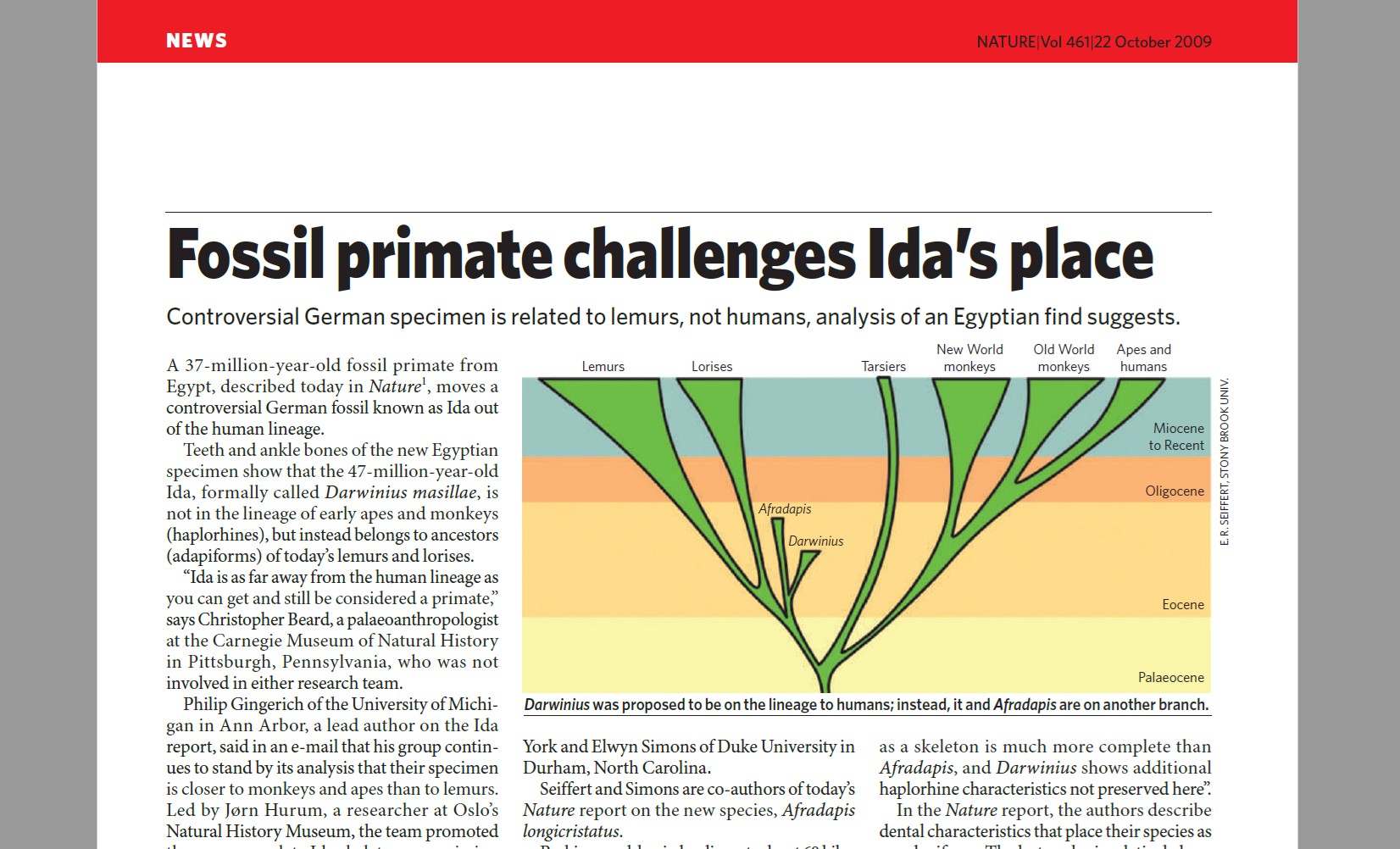 Nature reported:A 37-million-year-old fossil primate from Egypt moves a controversial German fossil known as Ida out of the human lineage.** Wired said:Darwinius seems merely to have gone extinct, leaving no descendants.** The Guardian headlined 'Eighth wonder' Ida is not related to humans, claim scientists **. Etcetera.