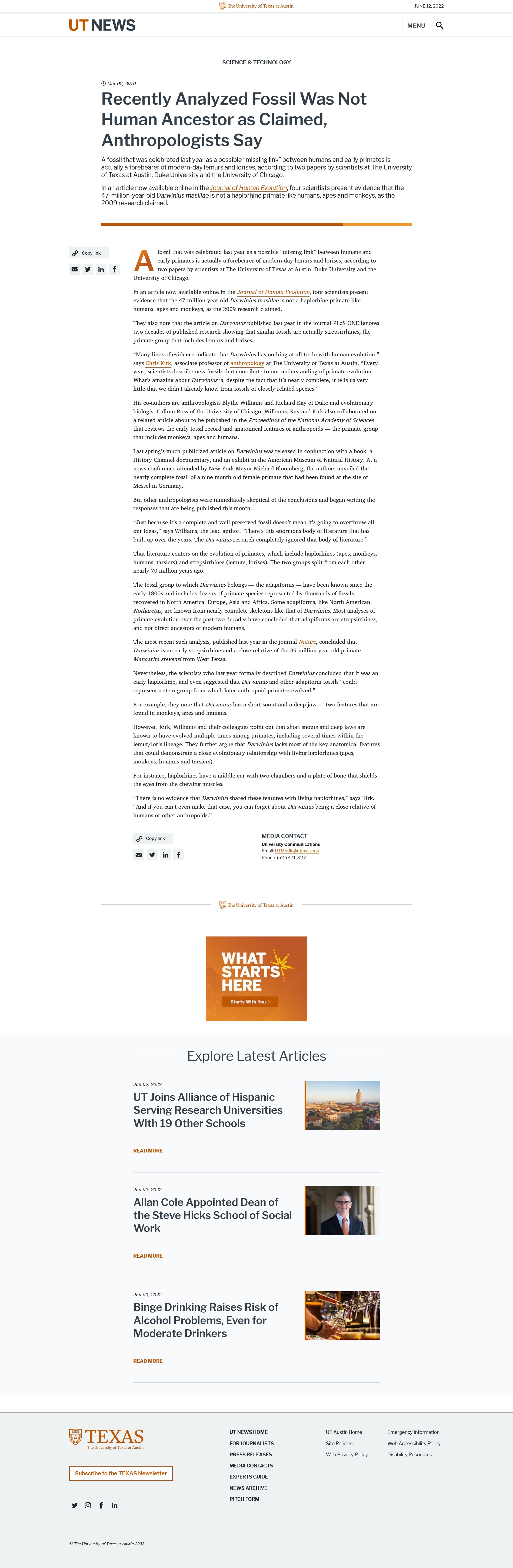 University of Texas - Recently Analyzed Fossil Was Not Human Ancestor as Claimed