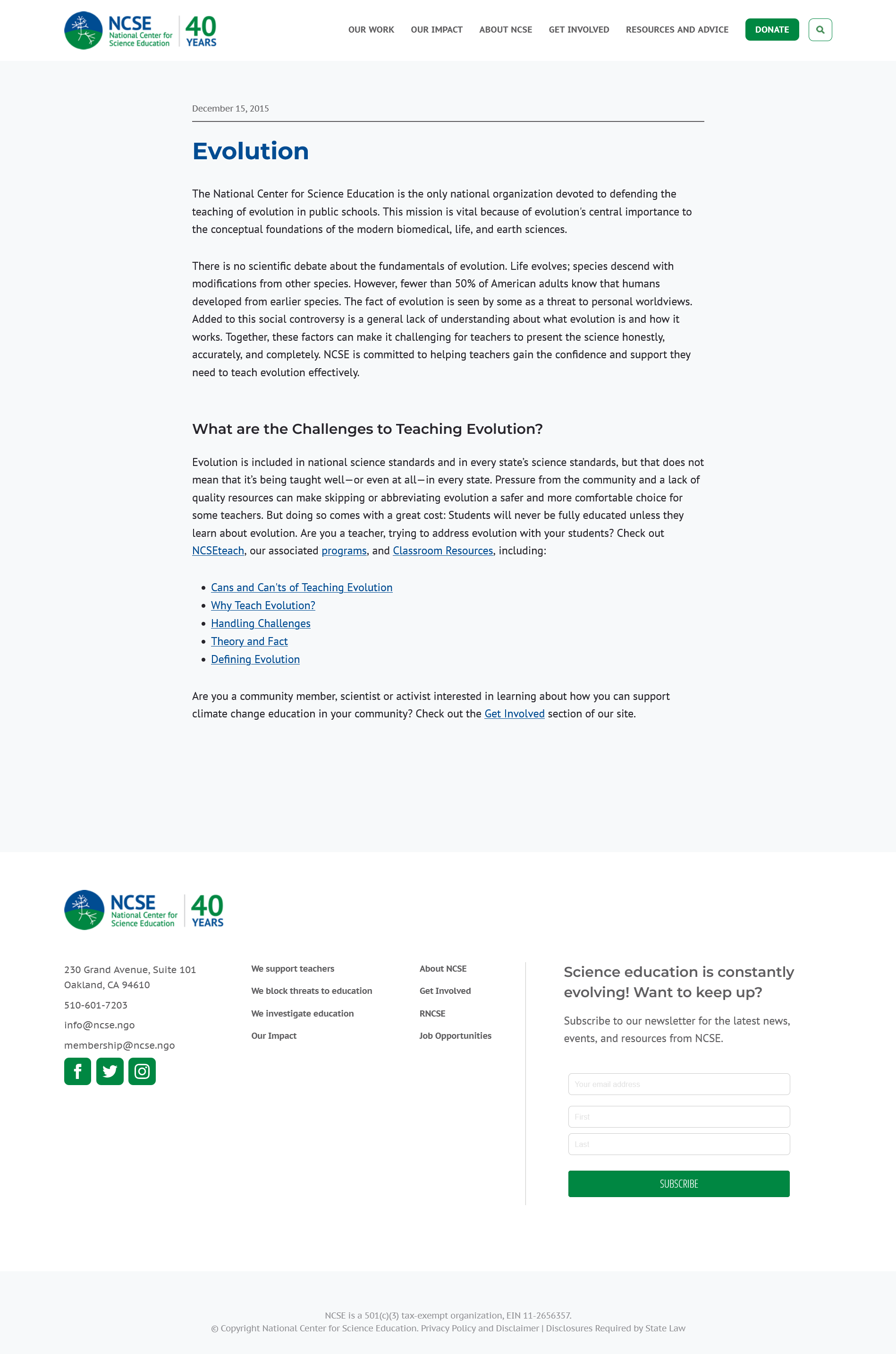 NCSE defends the integrity of science education against ideological interference. We work with teachers, parents, scientists, and concerned citizens at the local, state, and national levels to ensure that topics including evolution and climate change are taught accurately, honestly, and confidently.