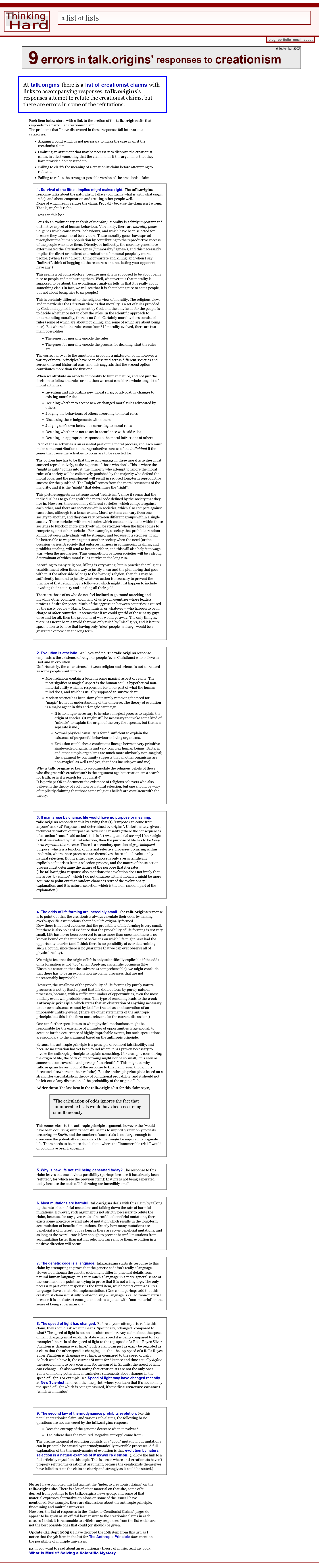 Talk.Origins ... maintains an extensive FAQ on topics in evolutionary biology, geology and astronomy, with the aim of representing the views of mainstream science. It has spawned other websites, notably TalkDesign "a response to the intelligent design movement", Evowiki, and the Panda's Thumb weblog.*