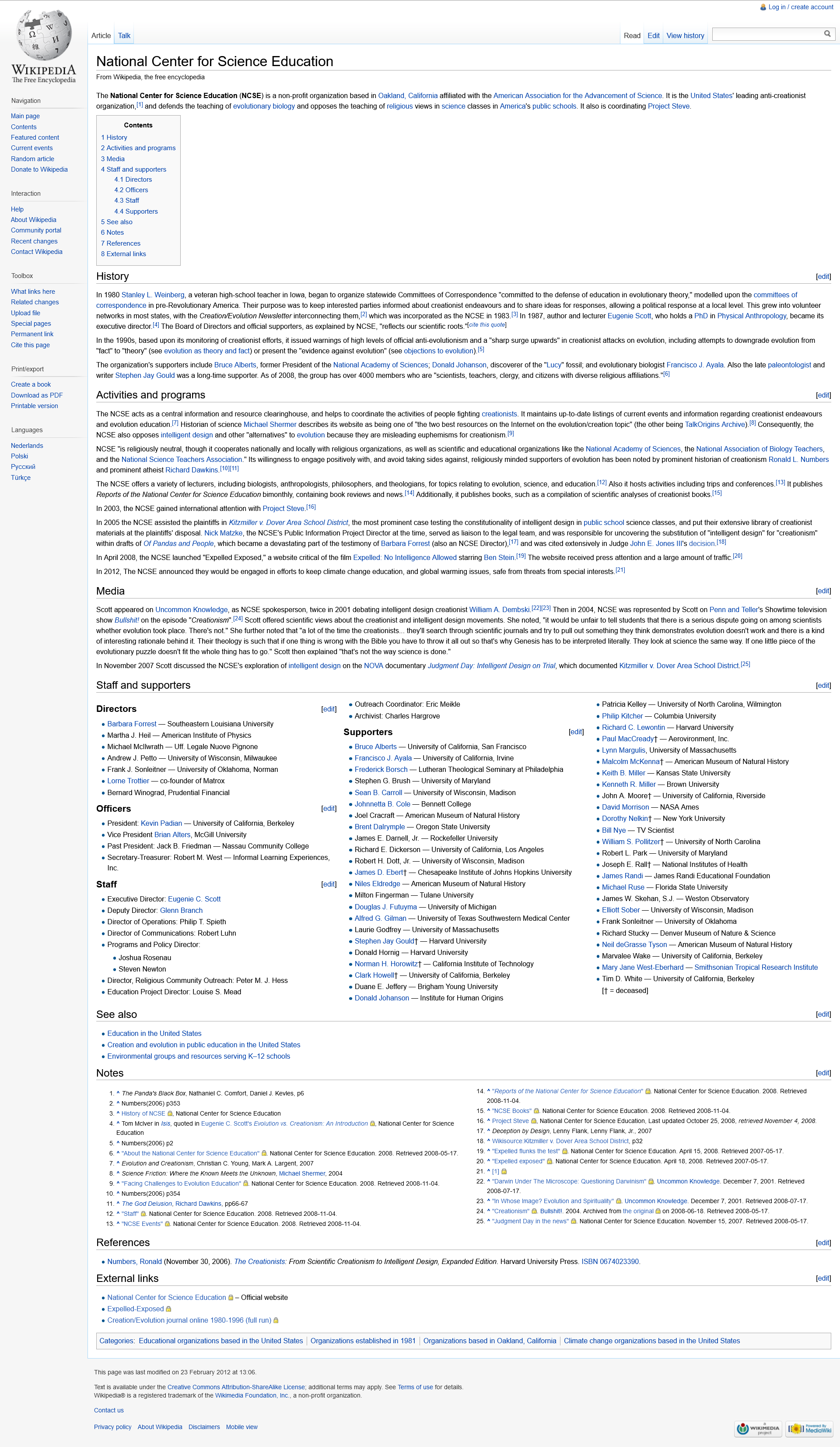 The National Center for Science Education (NCSE) is a not-for-profit membership organization in the United States whose stated mission is to educate the press and the public on the scientific and educational aspects of controversies surrounding the teaching of evolution and climate change, and to provide information and resources to schools, parents, and other citizens working to keep those topics in public school science education.*
