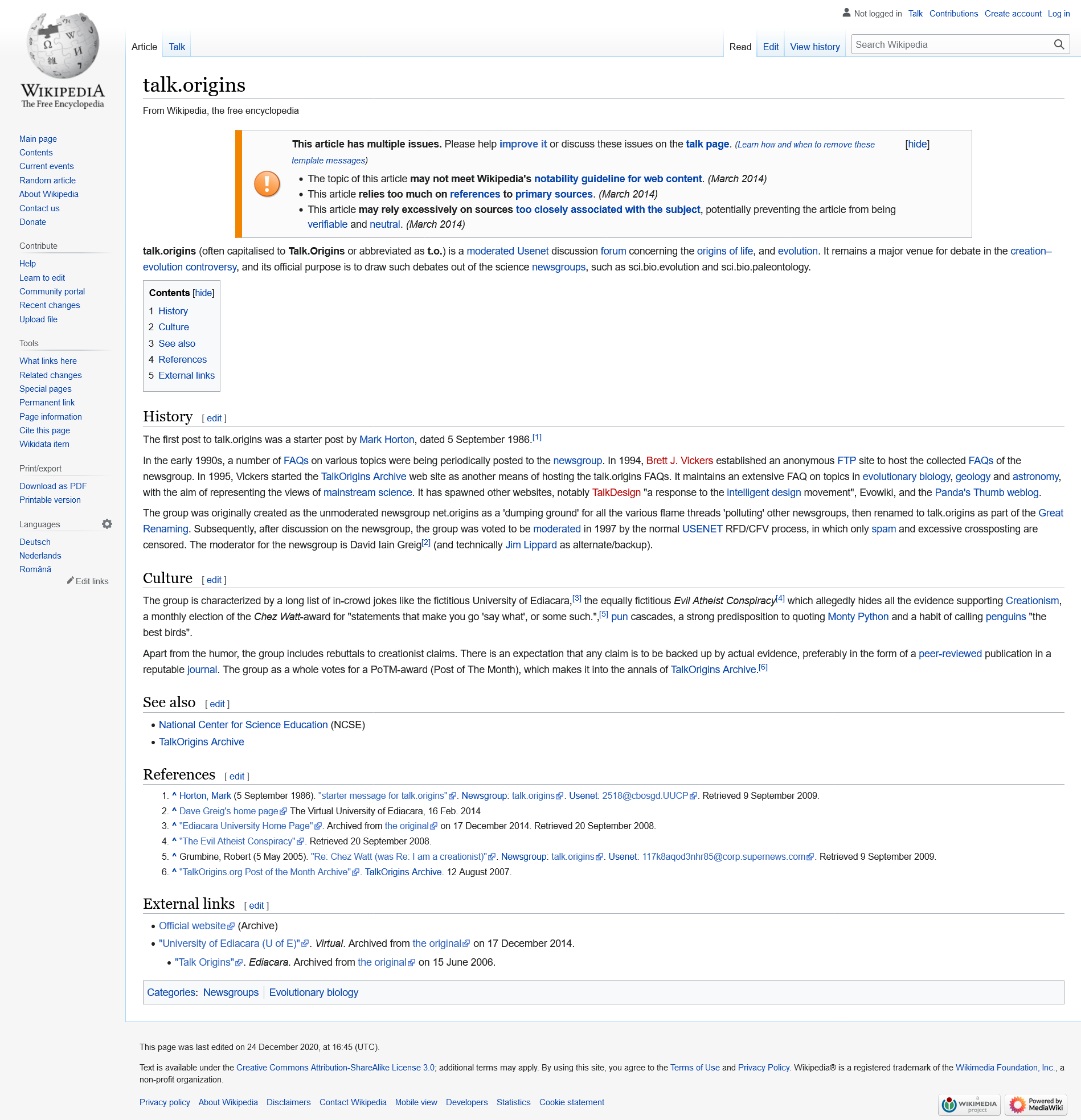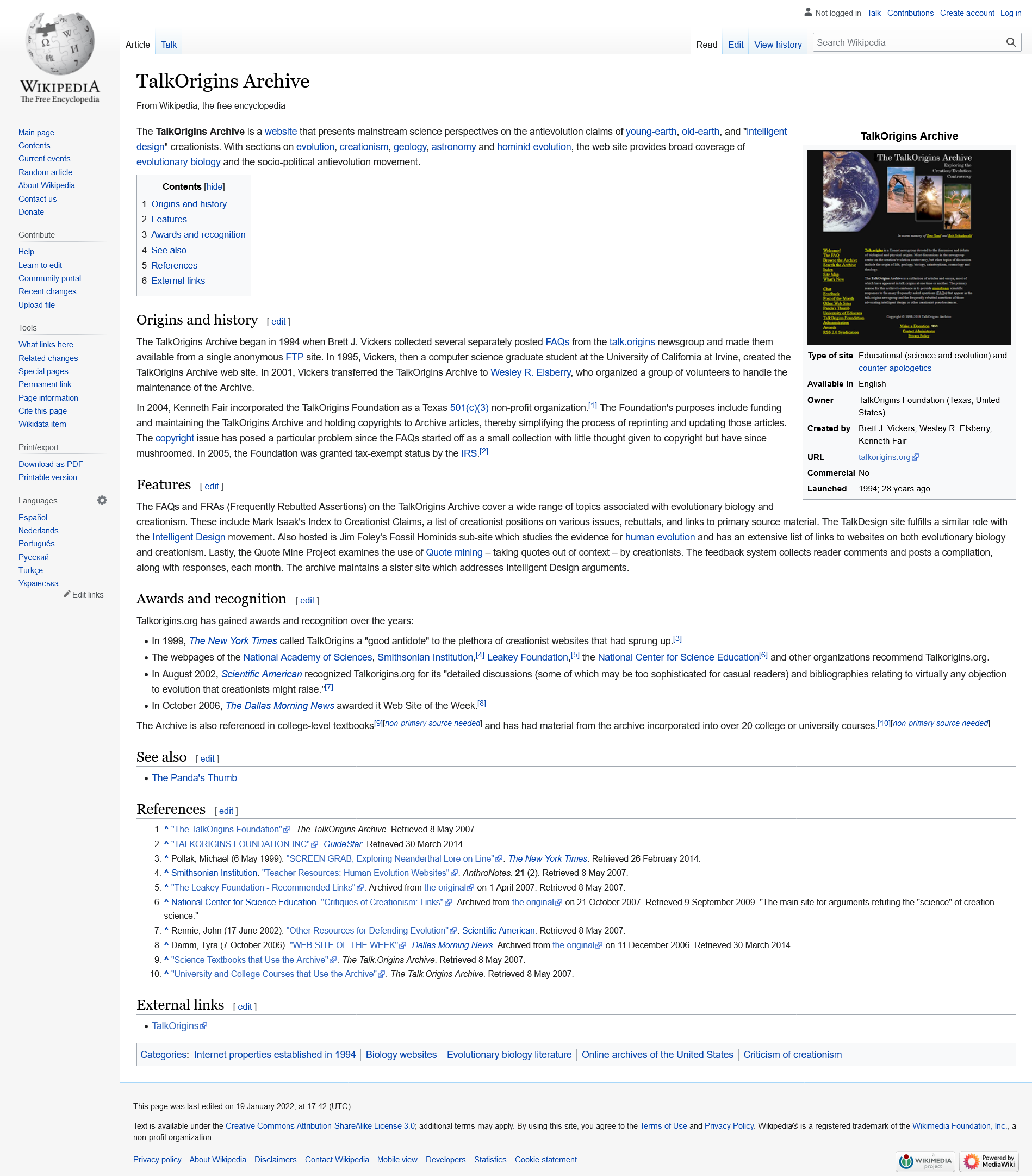 Talkorigins.org has gained awards and recognition over the years ... The Archive is also referenced in college-level textbooks and has had material from the archive incorporated into over 20 college or university courses.*