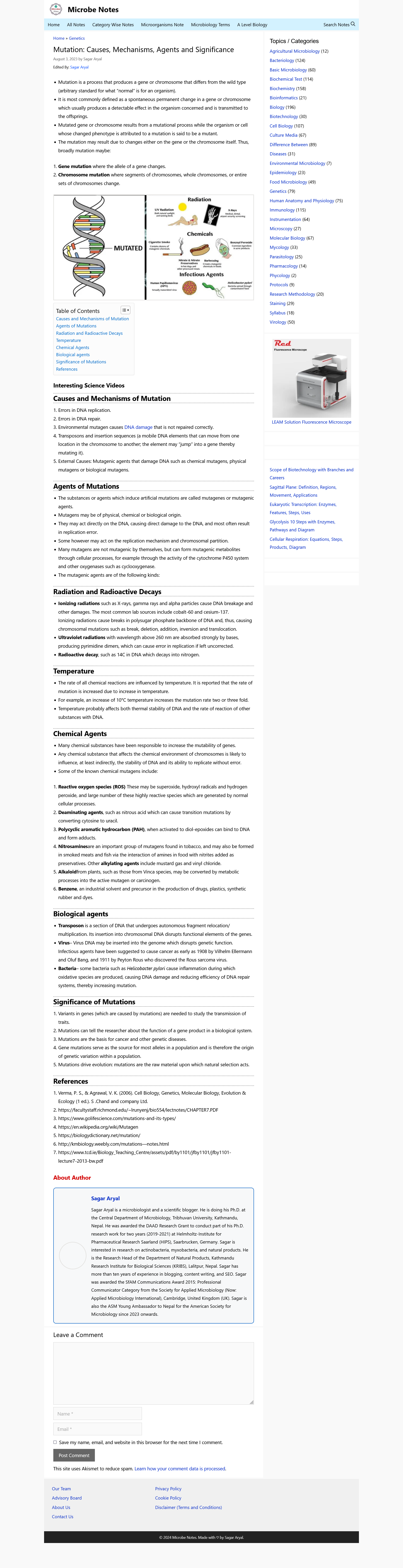 Mutations result from errors during DNA replication or other types of damage to DNA... Mutations are caused by radiation, viruses, transposons and mutagenic chemicals, as well as errors that occur during meiosis or DNA replication. They can also be induced by the organism itself, by cellular processes such as hypermutation.*