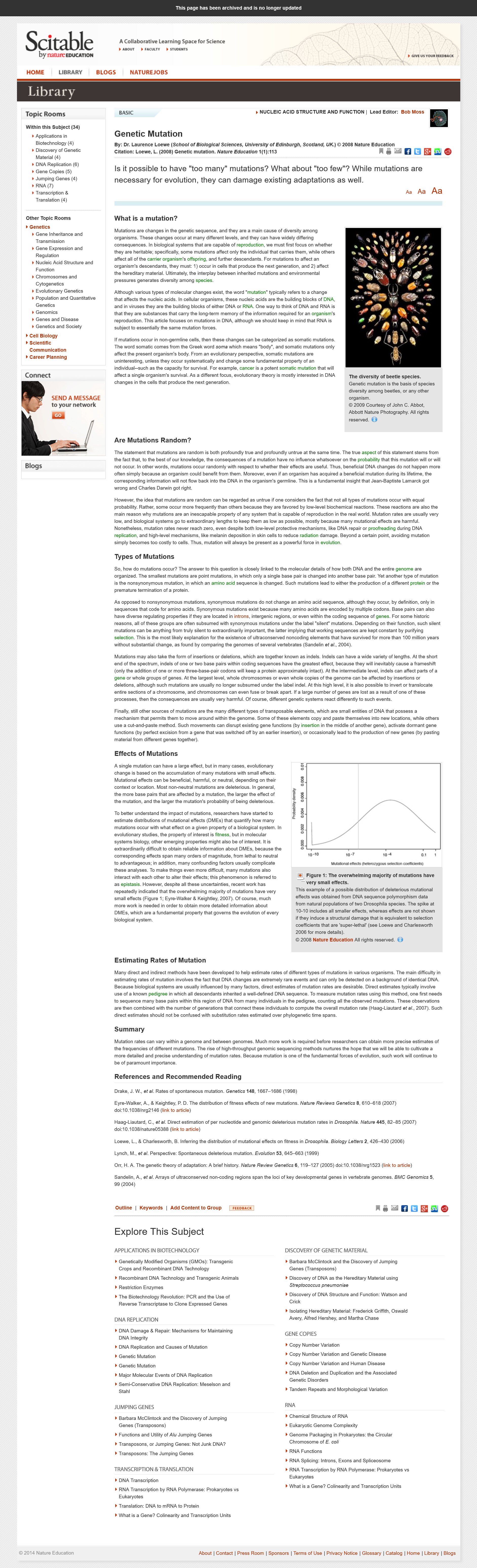 Mutations are changes in the genetic sequence, and they are a main cause of diversity among organisms. These changes occur at many different levels, and they can have widely differing consequences. In biological systems that are capable of reproduction, we must first focus on whether they are heritable; specifically, some mutations affect only the individual that carries them, while others affect all of the carrier organism's offspring, and further descendants. For mutations to affect an organism's descendants, they must: 1) occur in cells that produce the next generation, and 2) affect the hereditary material. Ultimately, the interplay between inherited mutations and environmental pressures generates diversity among species.*