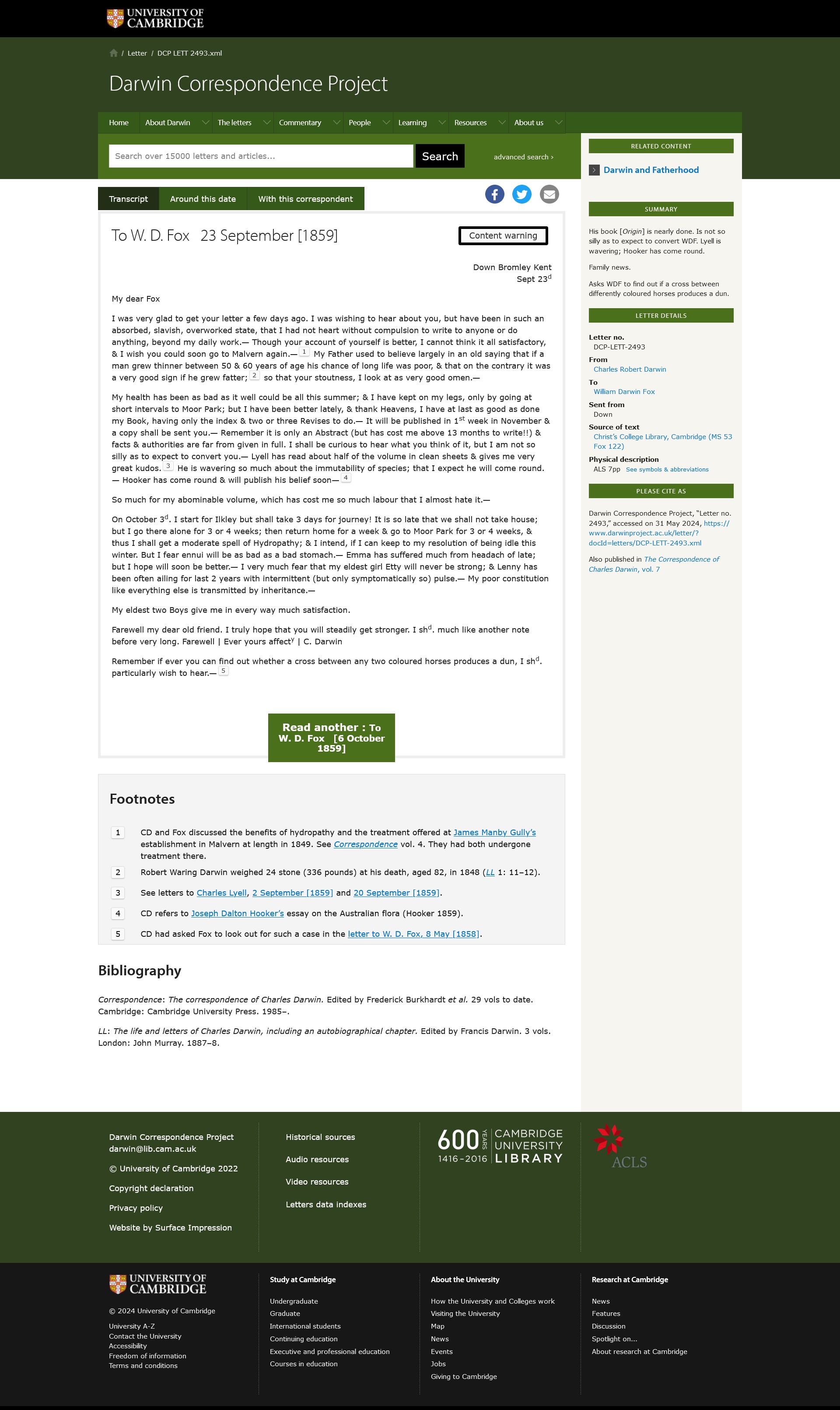 Charles Darwin - Letter to William Darwin Fox (23 September, 1859)