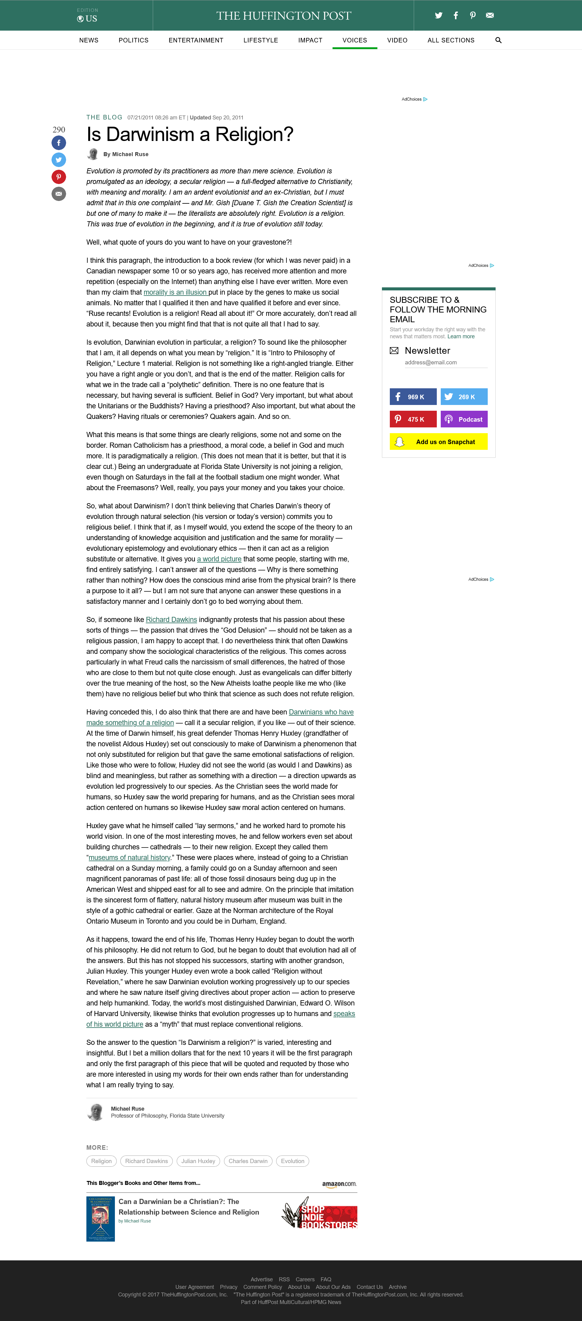Evolution is promoted by its practitioners as more than mere science. Evolution is promulgated as an ideology, a secular religion — a full-fledged alternative to Christianity, with meaning and morality. I am an ardent evolutionist and an ex-Christian, but I must admit that in this one complaint — and Mr. Gish is but one of many to make it — the literalists are absolutely right. Evolution is a religion. This was true of evolution in the beginning, and it is true of evolution still today.*