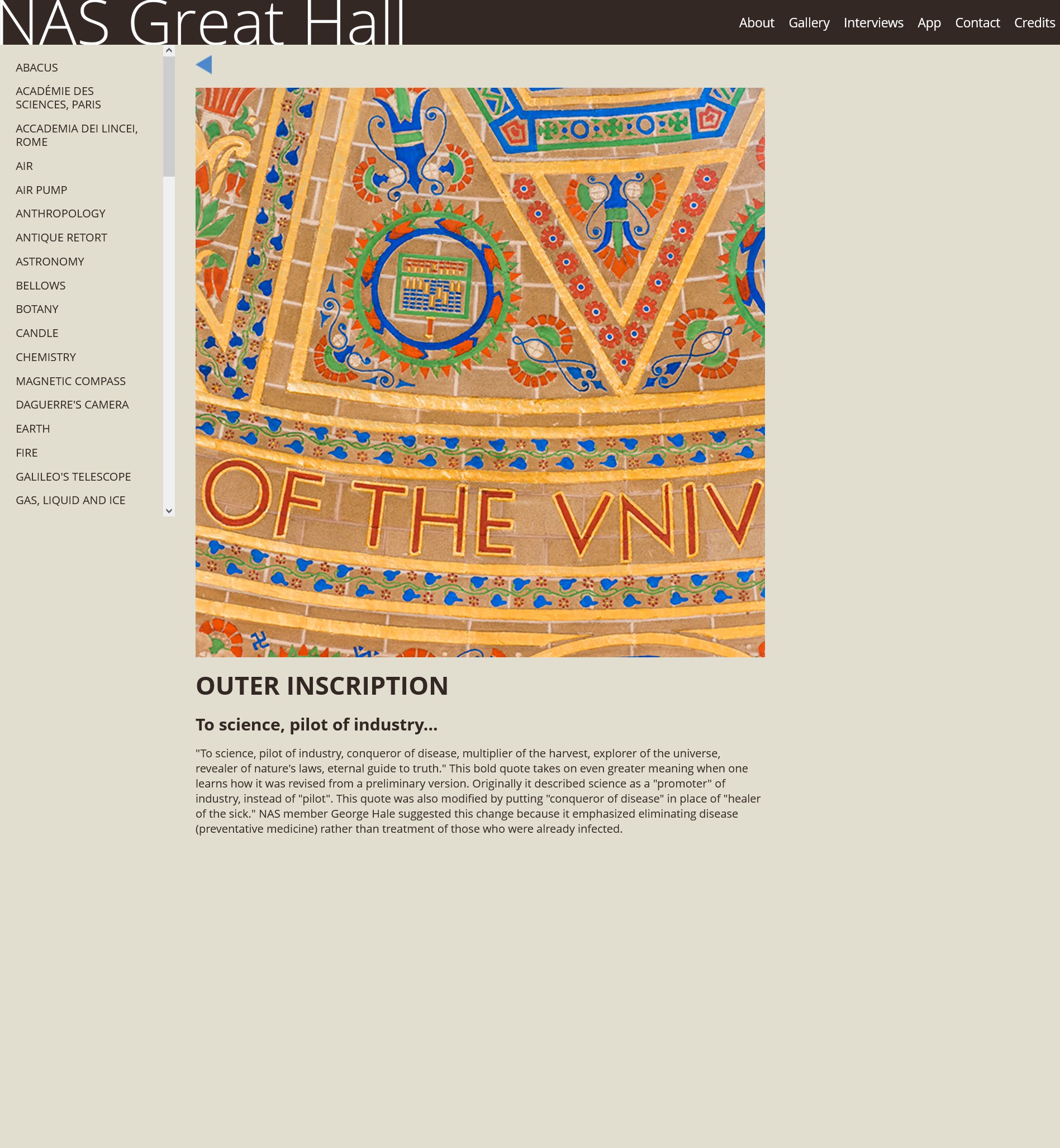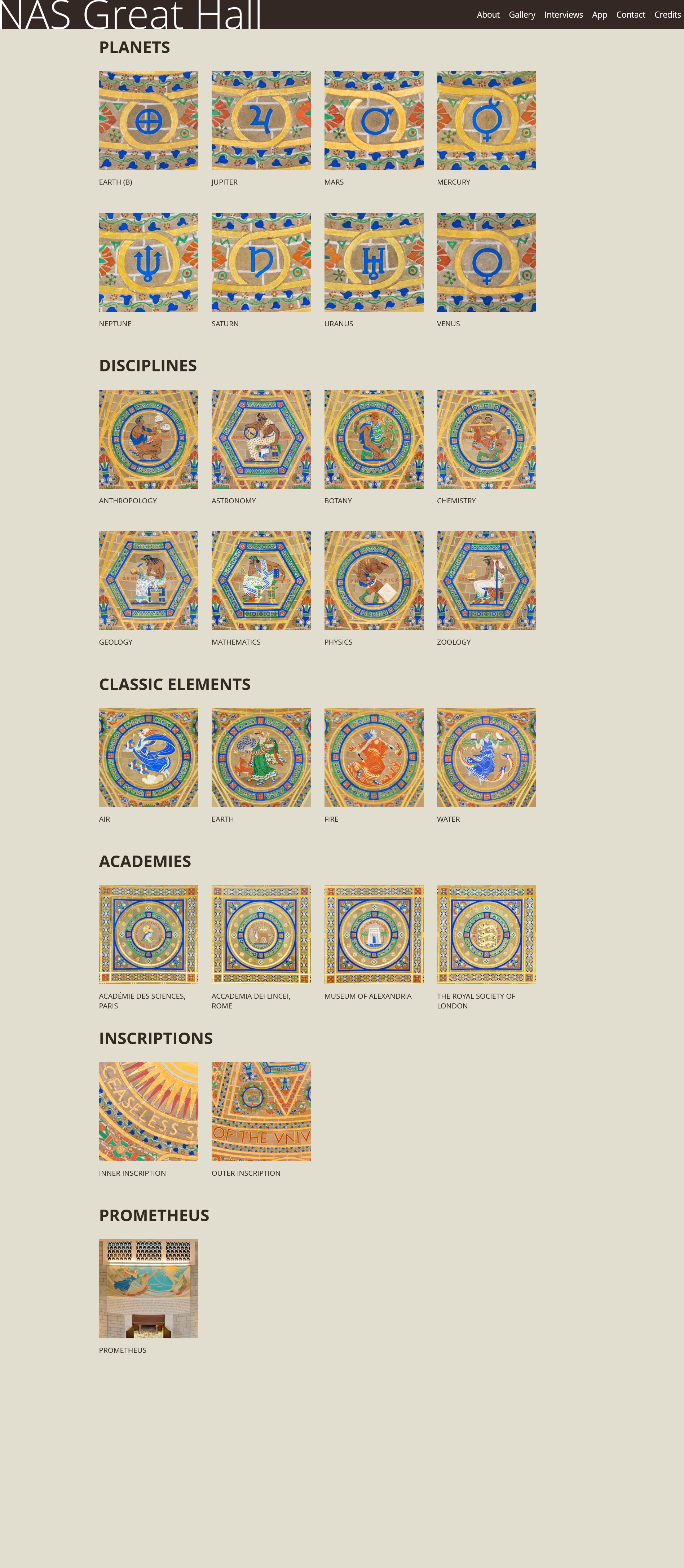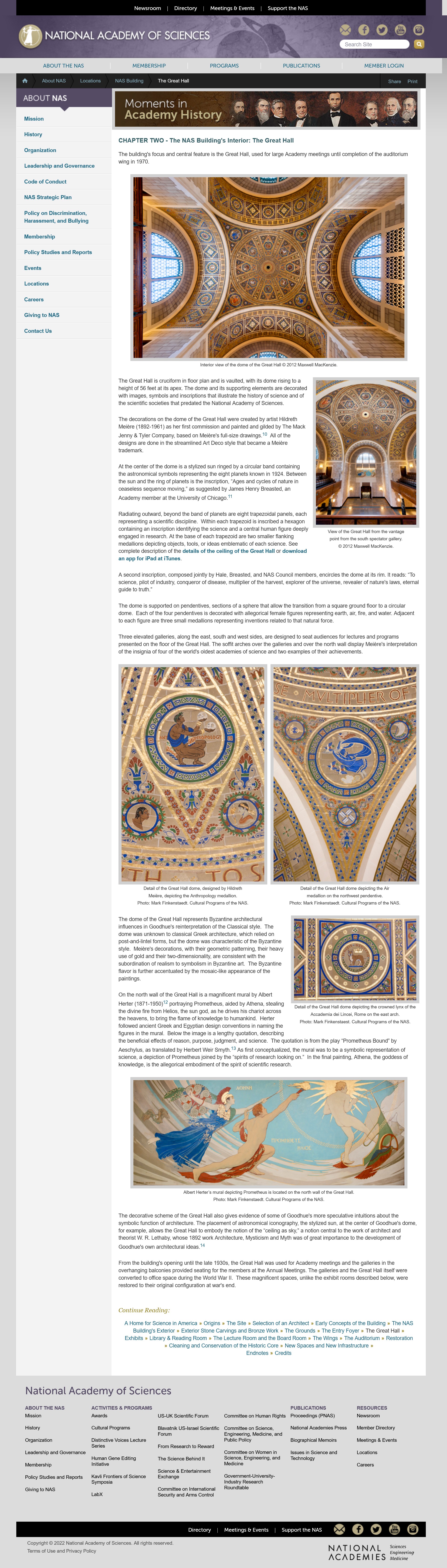 The Great Hall is cruciform in floor plan and is vaulted, with its dome rising to a height of 56 feet at its apex. The dome and its supporting elements are decorated with images, symbols and inscriptions that illustrate the history of science and of the scientific societies that predated the National Academy of Sciences. ... At the center of the dome is a stylized sun ringed by a circular band containing the astronomical symbols representing the eight planets known in 1924. Between the sun and the ring of planets is the inscription, "Ages and cycles of nature in ceaseless sequence moving,"*