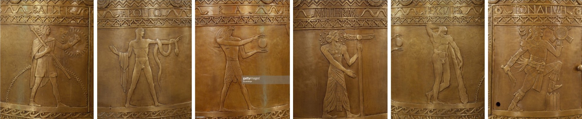 The statement that these ancient depictions symbolize human observations of nature is simply absurd. Never have winged lion fossils been found. These winged lions are Babylonian religious symbols and they represent the mythological goddess Ishtar. Babylon is known to be the origin of practically all modern-day religion. The architects of the NAS building openly admit that science itself has its origins in ancient religion. Science is based on assumptions and axioms which have to be taken by faith. Today it is fully based on the unprovable philosophy naturalism which of course is connected to nature worship. The religious depictions of for example the sun and the zodiac, which points to star worship, merely confirm it. The earth symbol used in the NAS building* is the same as the cross symbol of Christianity which is a symbol of sun worship. Etcetera.