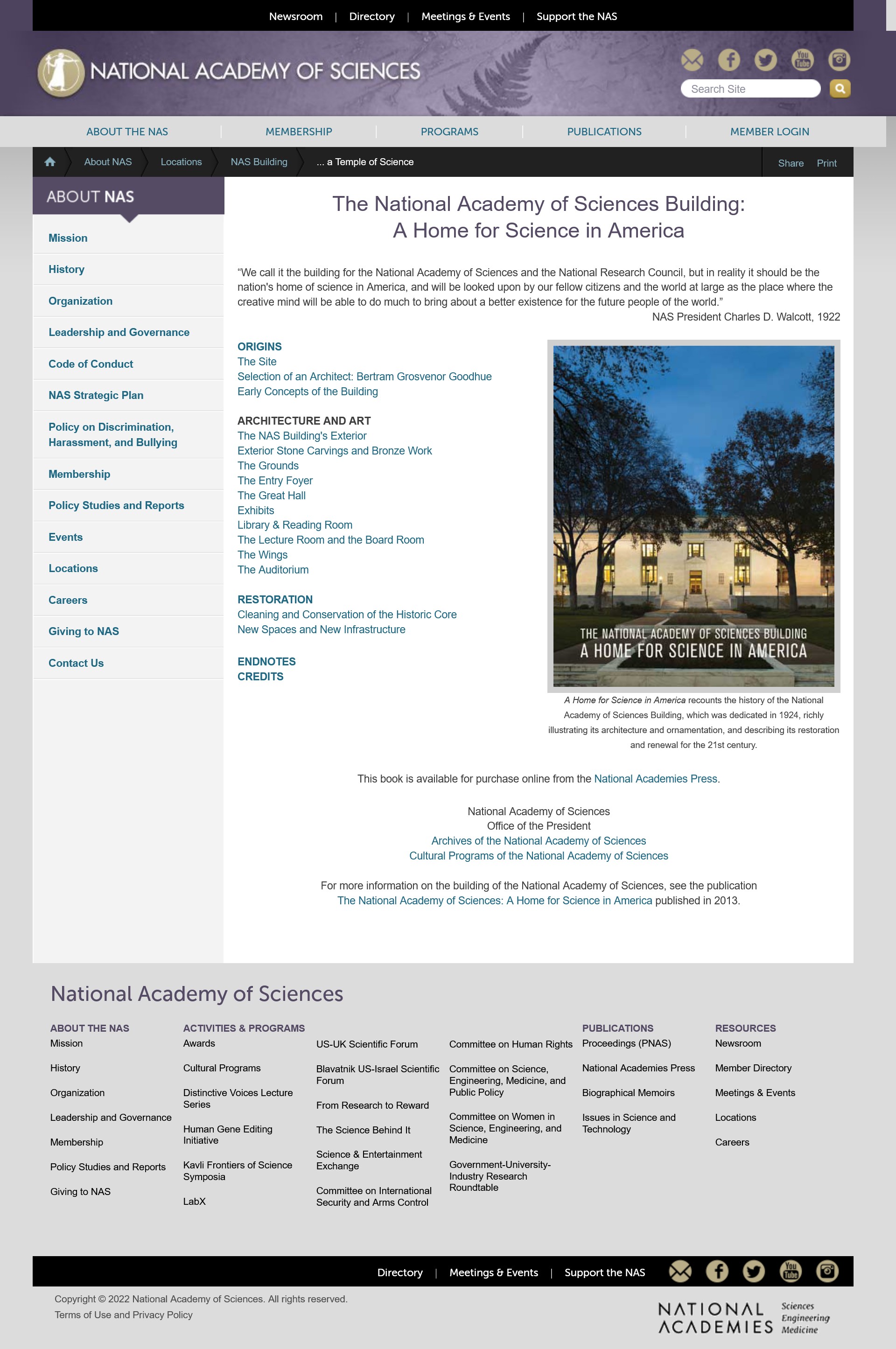 The NAS calls its building aTemple of Science**. It has a website called NAS Great Hall * * which offers a gallery of mythological figures used as decoration. The symbolism of the sun inside the pagan Roman dome and the cruciform points to sun worship.