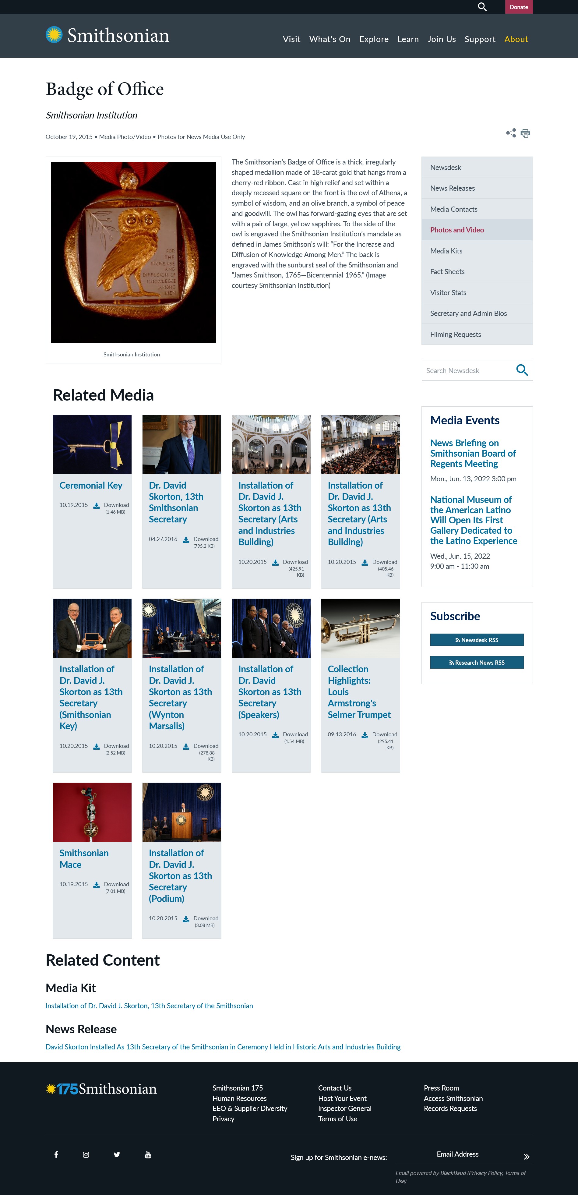 The Smithsonian "Badge of Office" contains an owl. Smithsonian explains the owl as follows:Cast in high relief and set within a deeply recessed square on the front is the owl of Athena, a symbol of wisdom** Owls are commonly associated with wisdom, knowledge, and contemplation. They have been seen as a symbol of the spirit world because they carry messages from it to ours. The Smithsonian Institution’s mission* as defined in James Smithson’s will is:For the Increase and Diffusion of Knowledge Among Men.** Symbols are not a coincidence. Knowledge is power.