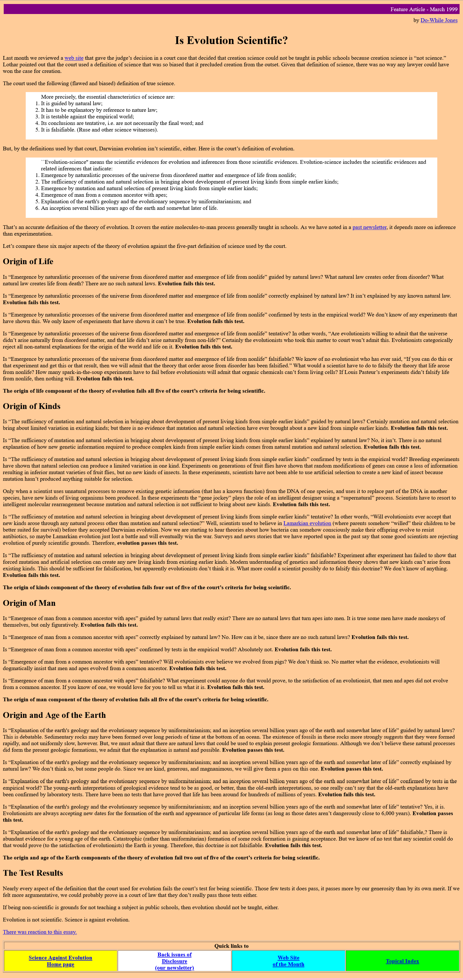 Darwin observed microevolution and presented a theory of unobservable macroevolution based on speculations. The reality is that nobody ever witnessed a life form change into another, nor did anybody observe the appearance of new functional features not already present in the genetic makeup of an existing life form. This is common knowledge. Evolutionists go far beyond the limits of science in order to try to find evidence for their fanatic belief. Testing macroevolution in a laboratory is impossible. Therefore they added incredible amounts of time and invented untestable mathematical theories based on assumptions in an attempt to support their belief. See neo-Darwinism. The foundations of evolution theory are the philosophies naturalism and uniformitarianism and they are not scientific to begin with, they're philosophical assumptions.