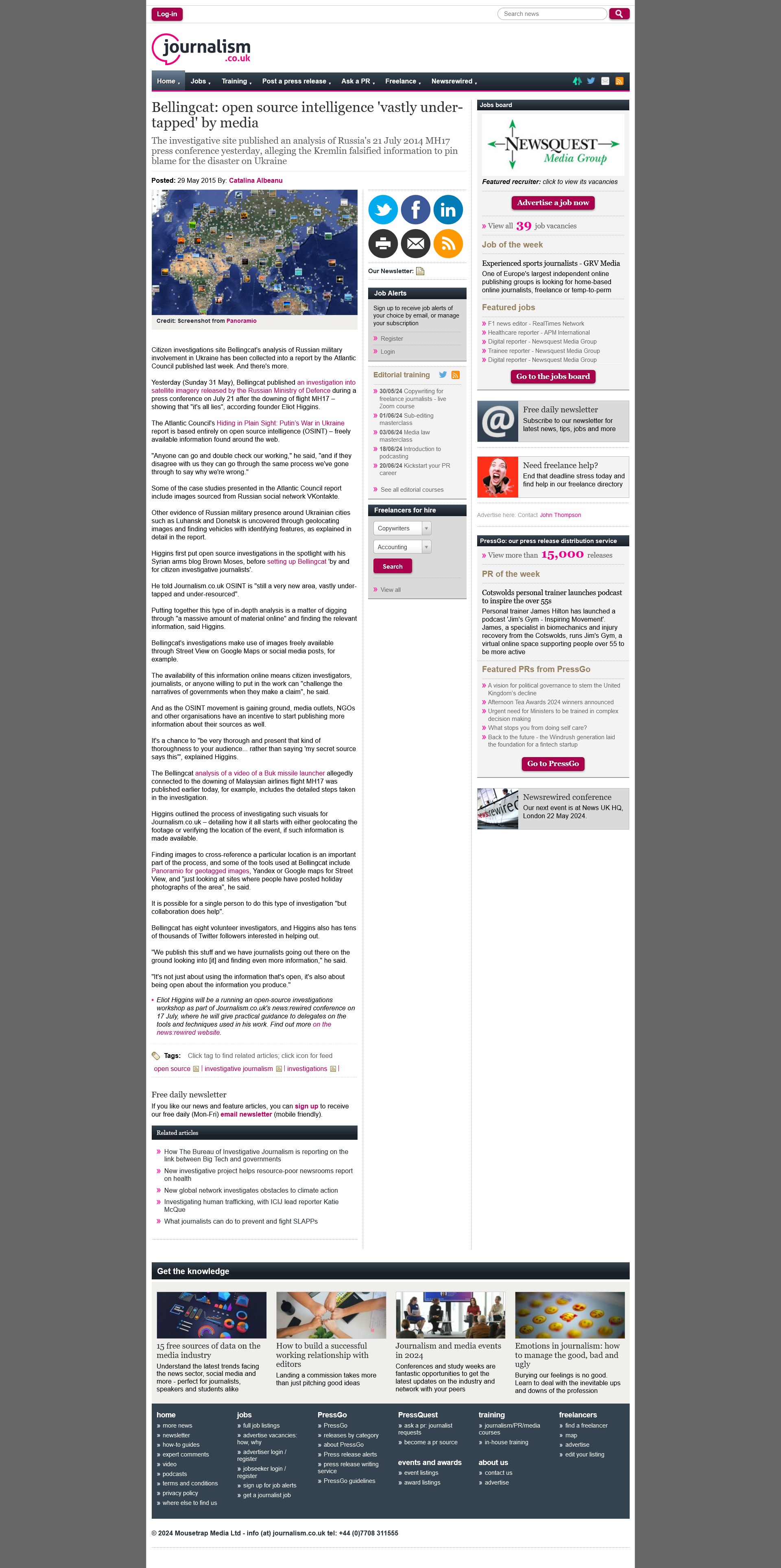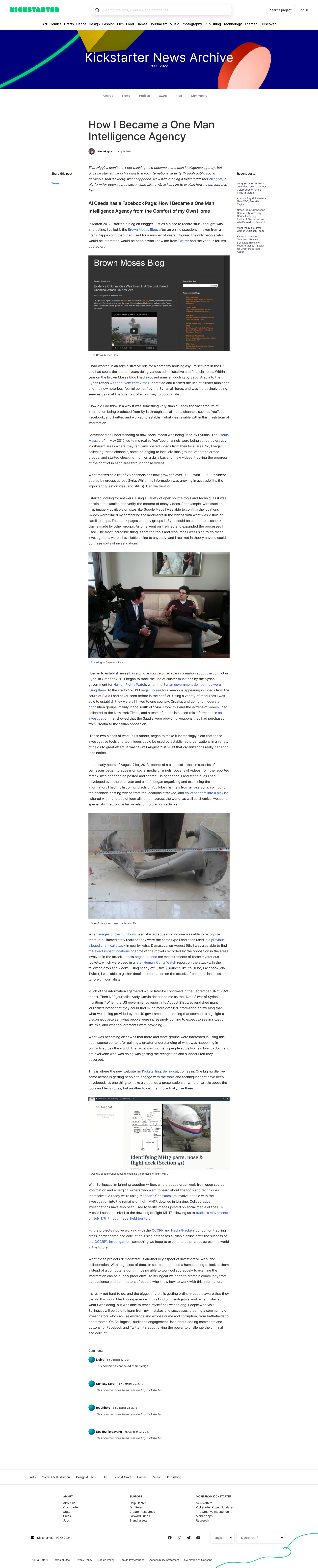 Eliot Higgins is the main character behind Bellingcat. He has been profiled in print by The Guardian, The Independent, The Huffington Post, and The New Yorker. Television features have been run by Channel 4 News and CNN International.* Australia's number one news site news.com.au has an article titled Bellingcat citizen journalist Eliot Higgins is holding global governments to account **. Newsweek has one titled Meet Eliot Higgins, Putin's MH17 Nemesis **. Independent has an article titled With Isis, Assad and Putin exposed, who's next on citizen journalist Eliot Higgins' list? **