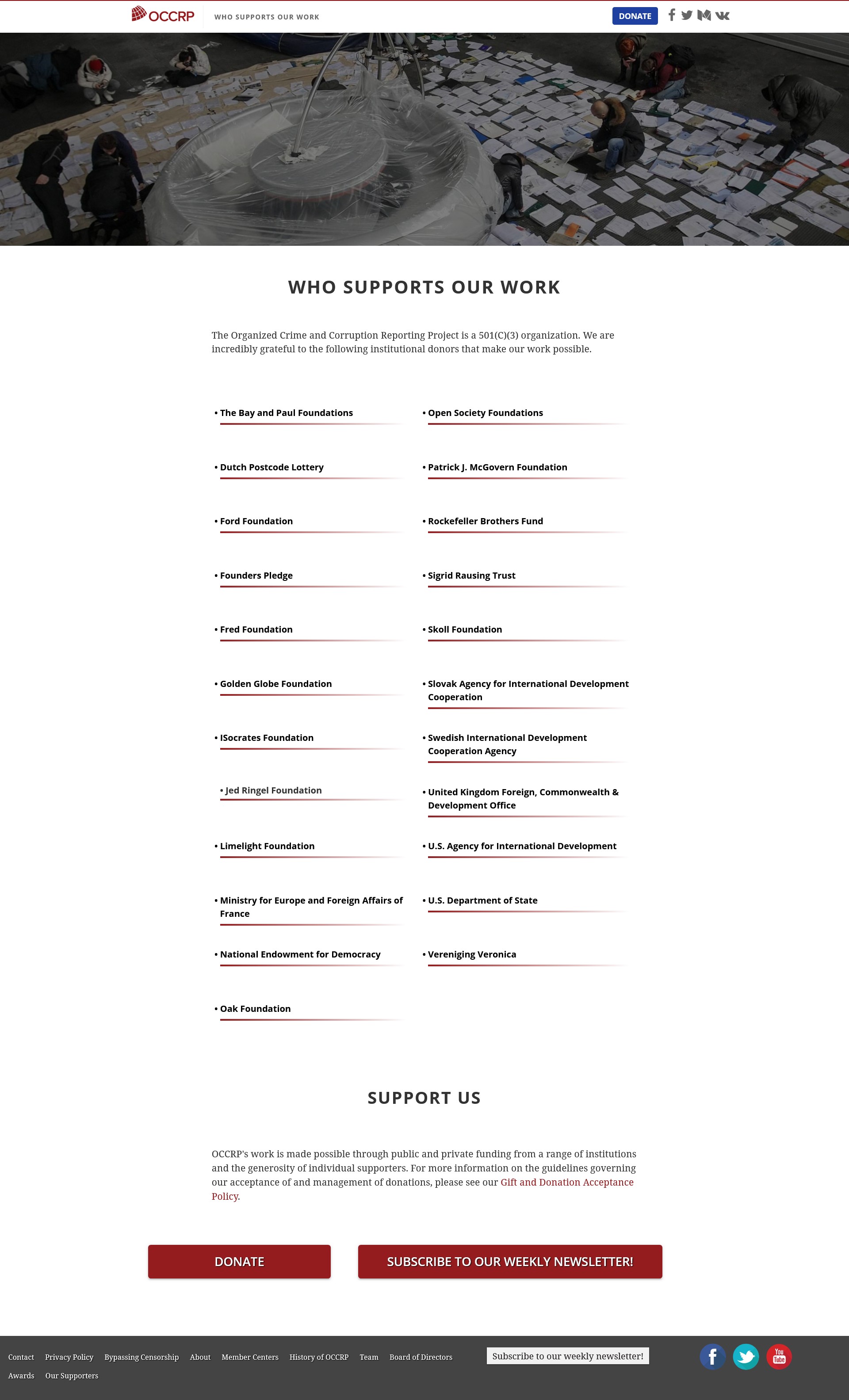 In August 2014 Eliot Higgins said in an interview:Future projects involve working with the OCCRP and Hacks/Hackers London on tracking cross-border crime and corruption.** There is collaboration between Bellingcat, Hacks/Hackers London and the Organised Crime and Corruption Reporting Project (OCCRP).* OCCRP is supported by the Open Society Foundation run by billionaire George Soros, Rockefeller Brothers Fund, Ford Foundation, U.S. Department of State, United Kingdom Foreign, Commonwealth & Development Office, USAID, National Endowment for Democracy, and others.* The Ford and Rockefeller families are two of the richest families on earth with much influence and they are likely some of the main drivers behind all this. USAID is another interesting organization...