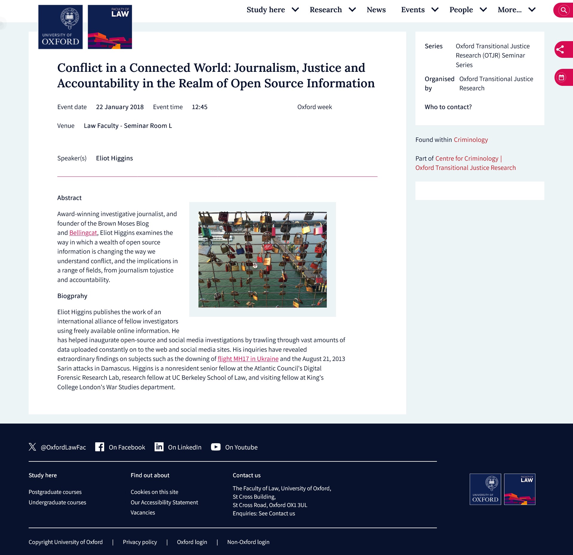 Eliot Higgins even had his own personal Atlantic Council page* which in the meantime has been deleted. Oxford University gave Eliot Higgins a podium to spread his propaganda on 22 January 2018 saying:His inquiries have revealed extraordinary findings on subjects such as the downing of flight MH17 in Ukraine and the August 21, 2013 Sarin attacks in Damascus. Higgins is a nonresident senior fellow at the Atlantic Council's Digital Forensic Research Lab.** Journalism.co.uk reported that Bellingcat's analysis of Russian military involvement in Ukraine has been collected into a report by the Atlantic Council.*