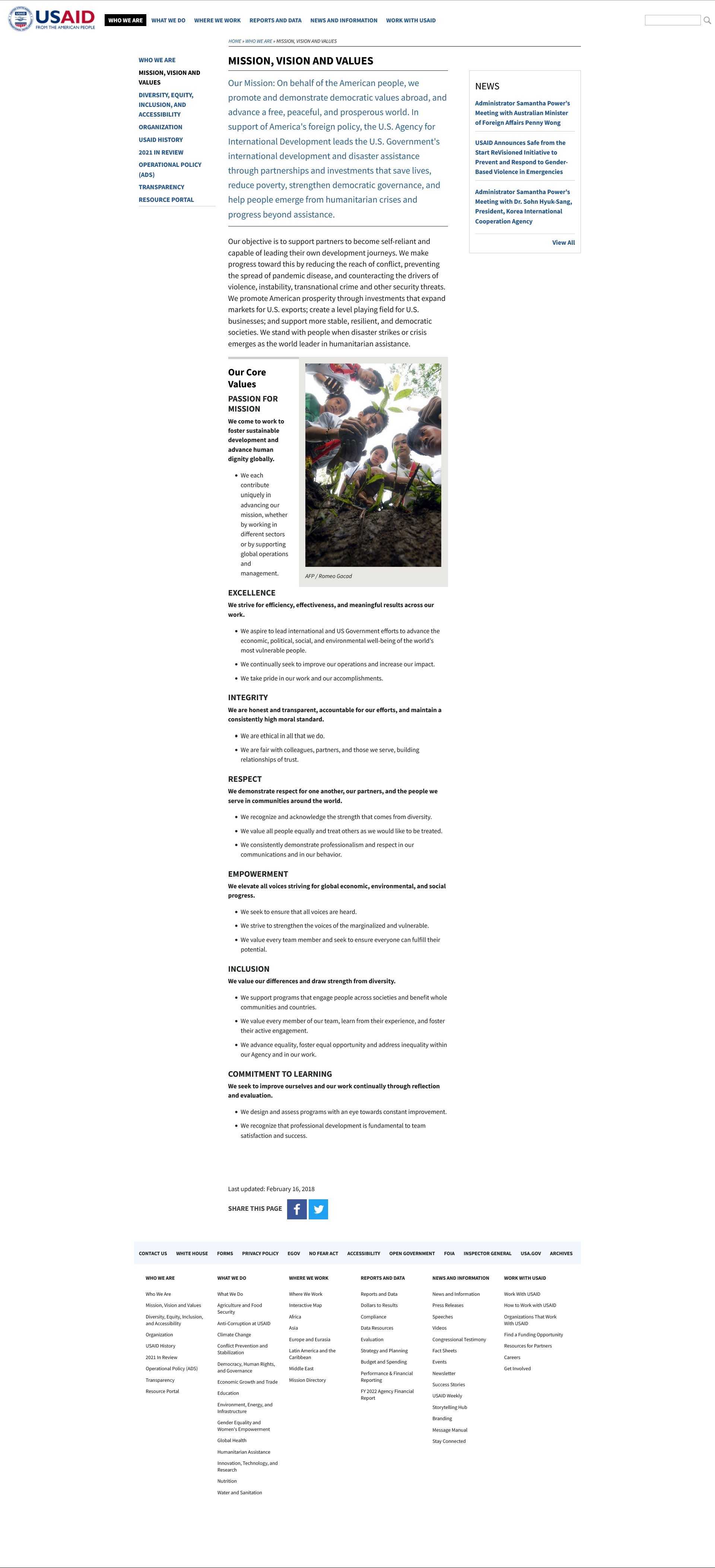 On behalf of the American people, we promote and demonstrate democratic values abroad, and advance a free, peaceful, and prosperous world. In support of America's foreign policy... We partner to end extreme poverty and promote resilient, democratic societies while advancing our security and prosperity.*