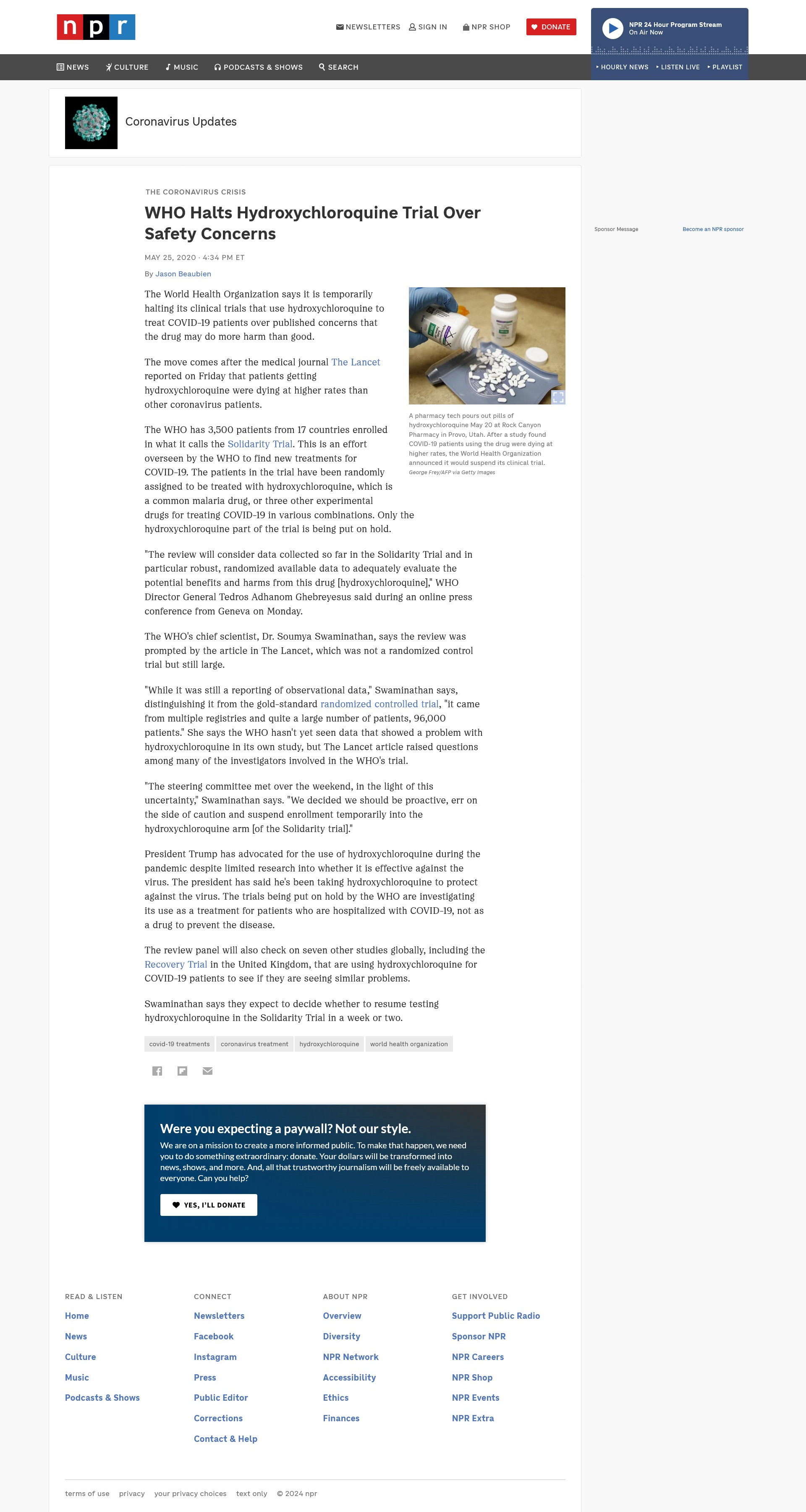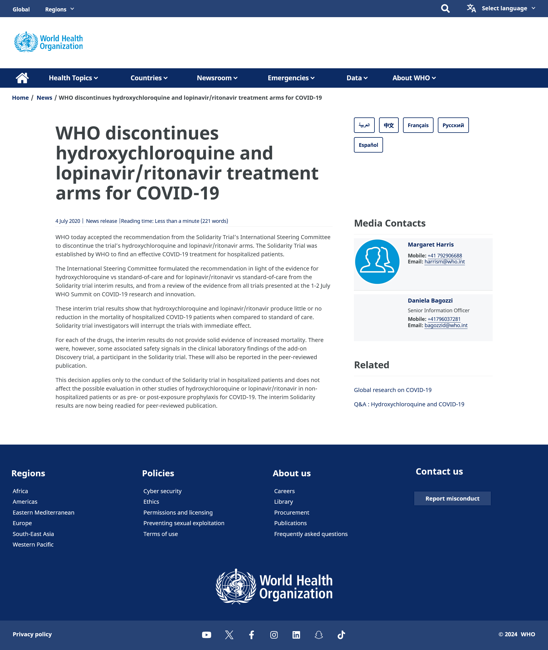 As expected, the outcome of this study is neutral to negative because HCQ was used completely contrary to how it should be used, it should be used as a preventative in the early stage of infection, not as a cure in a late stage of severe illness! Although this research adds very little to what we already knew about HCQ, it confirms that organizations like the WHO and related "high profile" scientists and governments are involved in strong negative bias against HCQ. More about this later.