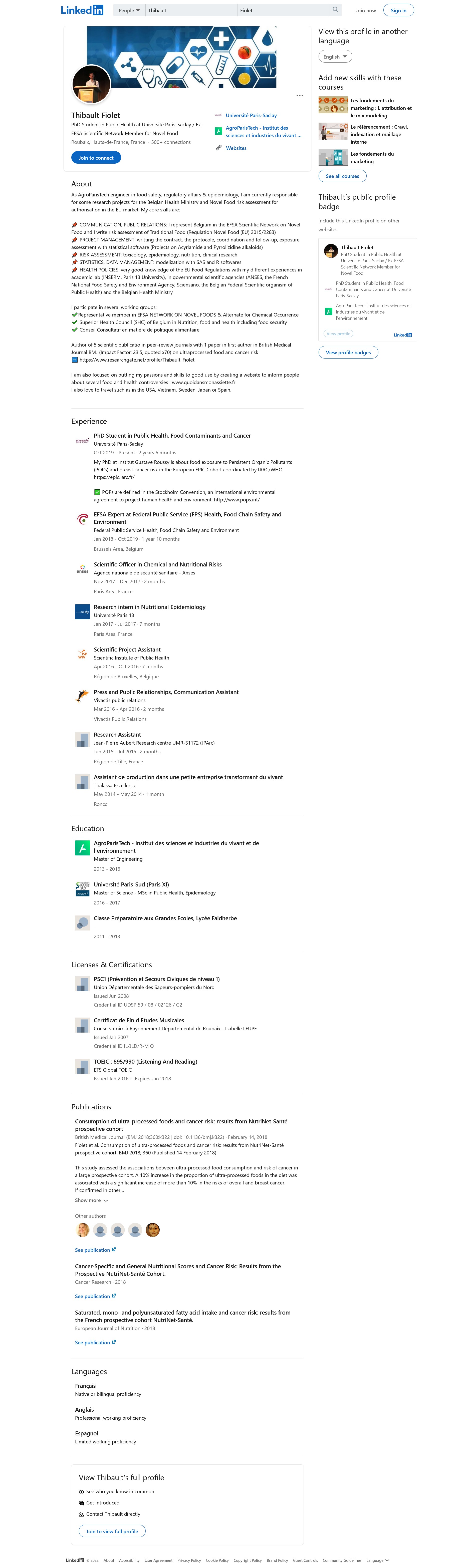 On top of that, Thibault Fiolet is linked to the World Health Organization* and to the World Economic Forum*, powerful organizations run by the power elite and the ultra-rich with a globalist agenda. According to his LinkedIn page* he is a PhD Student in Public Health, food contaminants and cancer at the University of Paris-Saclay of which he says: