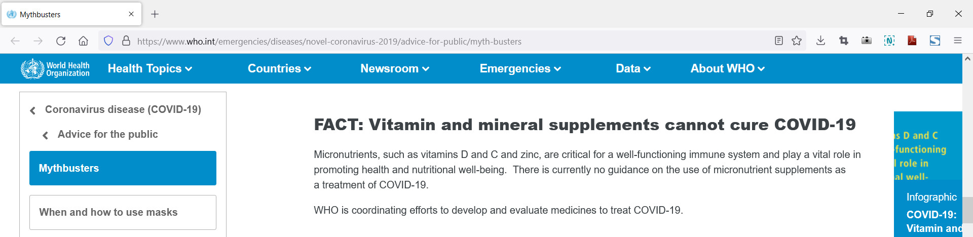 There's exactly one article about zinc on the WHO website! Of course vitamins and zinc cannot cure COVID-19, but something as simple and cheap as zinc supplements can take away zinc deficiency and therefore this can significantly bring down the development of complications and prolonged hospital stay. But the WHO is obviously not promoting the use of cheap zinc supplements that can make a big difference, because it states there's "no guidance on the use of micronutrient supplements as a treatment of COVID-19". Incredible.