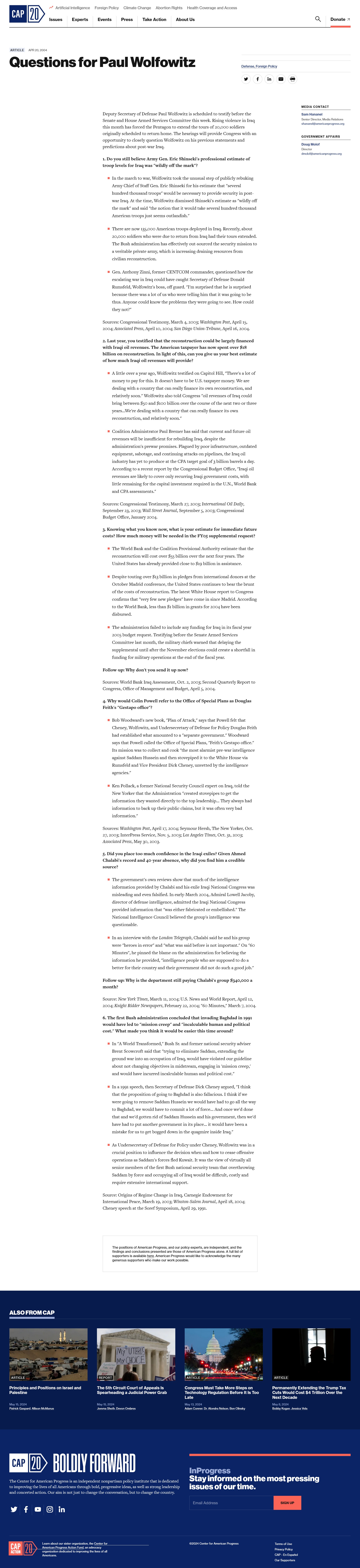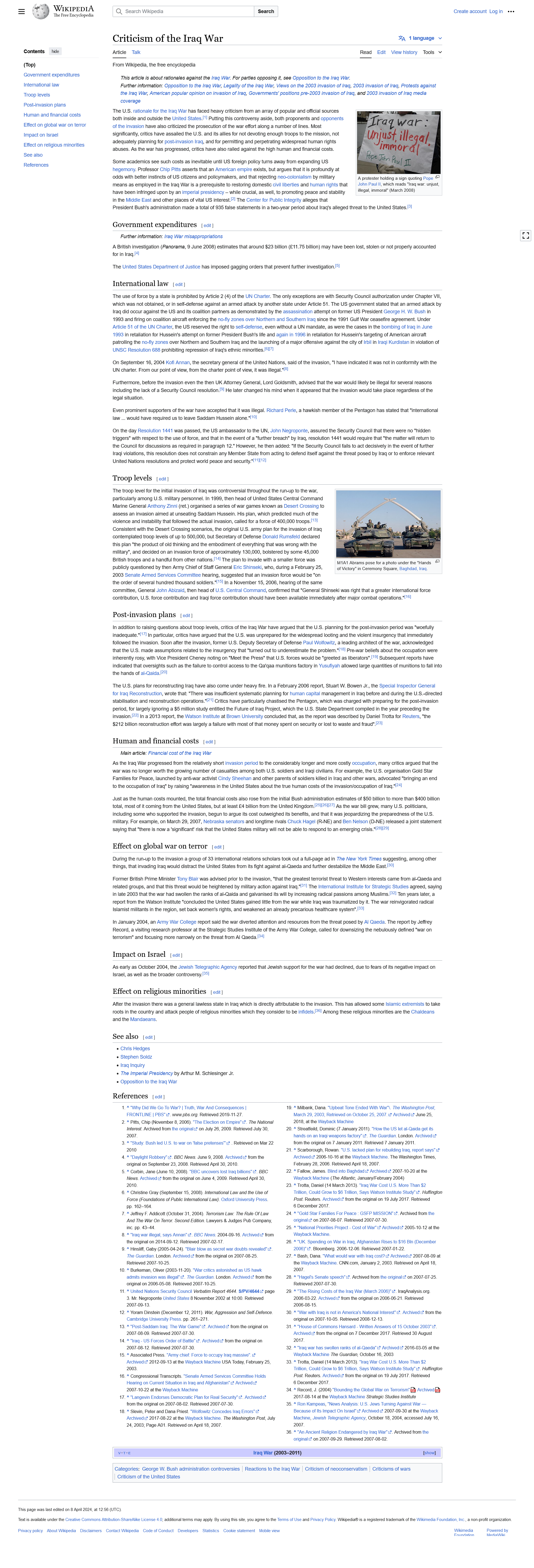 In April 2004 Paul Wolfowitz said:There's a lot of money to pay for this. It doesn't have to be U.S. taxpayer money. We are dealing with a country that can really finance its own reconstruction, and relatively soon.** However, Foreign Affairs reported:nine years after U.S. troops toppled Saddam Hussein and just a few months after the last U.S. soldier left Iraq, the country has become something close to a failed state.** The Iraq war was a complete humanitarian disaster. Population-based studies produce estimates of the number of Iraq War casualties* ranging from 151,000 violent deaths as of June 2006 (Iraq Family Health Survey) to 1,033,000 excess deaths (2007 Opinion Research Business survey).