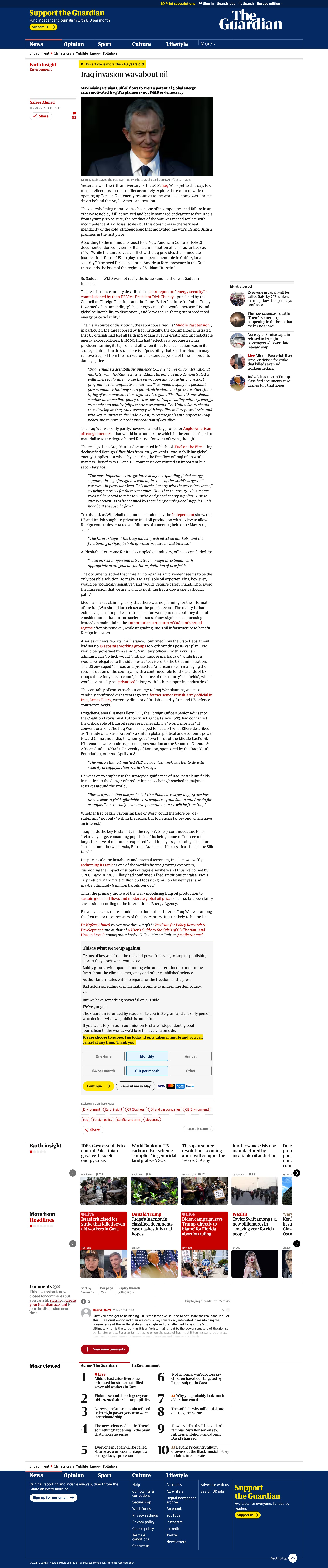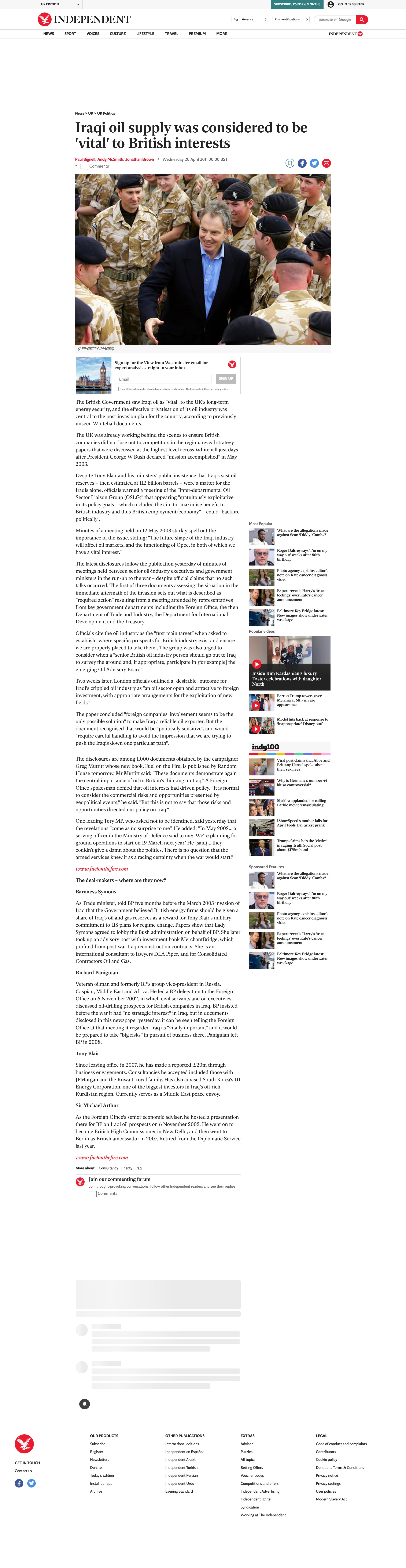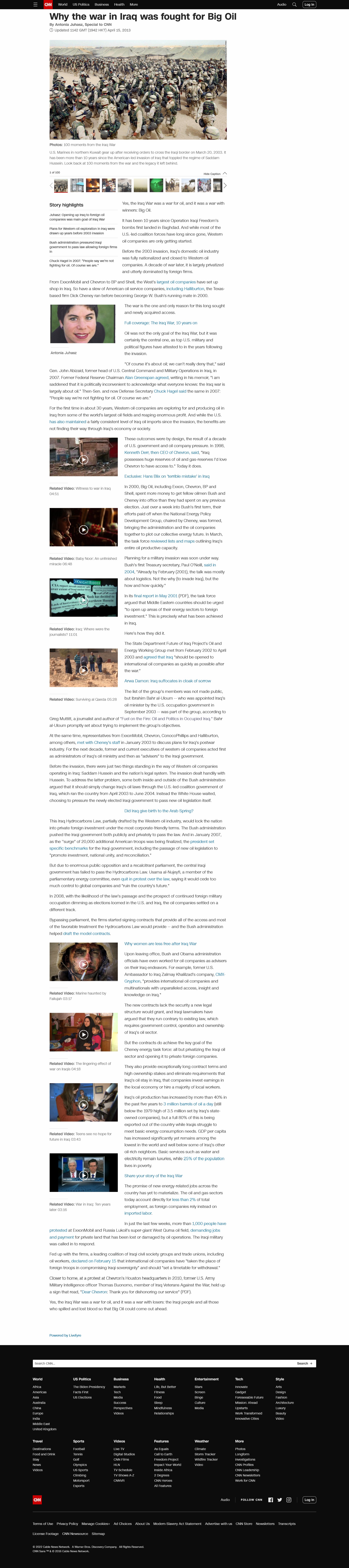 Iraqi oil played a major role in the lead up to the war. In May 2003 Paul Wolfowitz said:The most important difference between North Korea and Iraq is that economically, we just had no choice in Iraq. The country swims on a sea of oil.* After the invasion in October 2003 Dick Cheney said:In Iraq you've got a nation that's got the second-largest oil reserves in the world, second only to Saudi Arabia. It will generate billions of dollars a year in cash flow if they get back to their production of roughly three million barrels of oil a day, in the relatively near future.* In 2000 Iraq converted all its oil transactions under the corrupt UN Oil for Food program to Euros. After the US bombed Iraq and replaced Saddam the newly installed Iraqi US puppet regime returned oil sales from the Euro to the US Dollar. In 2011 newspaper Independent reported thatplans to exploit Iraq's oil reserves were discussed by government ministers and the world's largest oil companies the year before Britain took a leading role in invading Iraq.** In 2013 CNN reported:Yes, the Iraq War was a war for oil, and it was a war with winners: Big Oil.** In 2014 the Guardian reported:maximising Persian Gulf oil flows to avert a potential global energy crisis motivated Iraq War planners - not WMD or democracy.** It was and is obvious thatIraqi oil supply was considered to be 'vital' to British interests.**