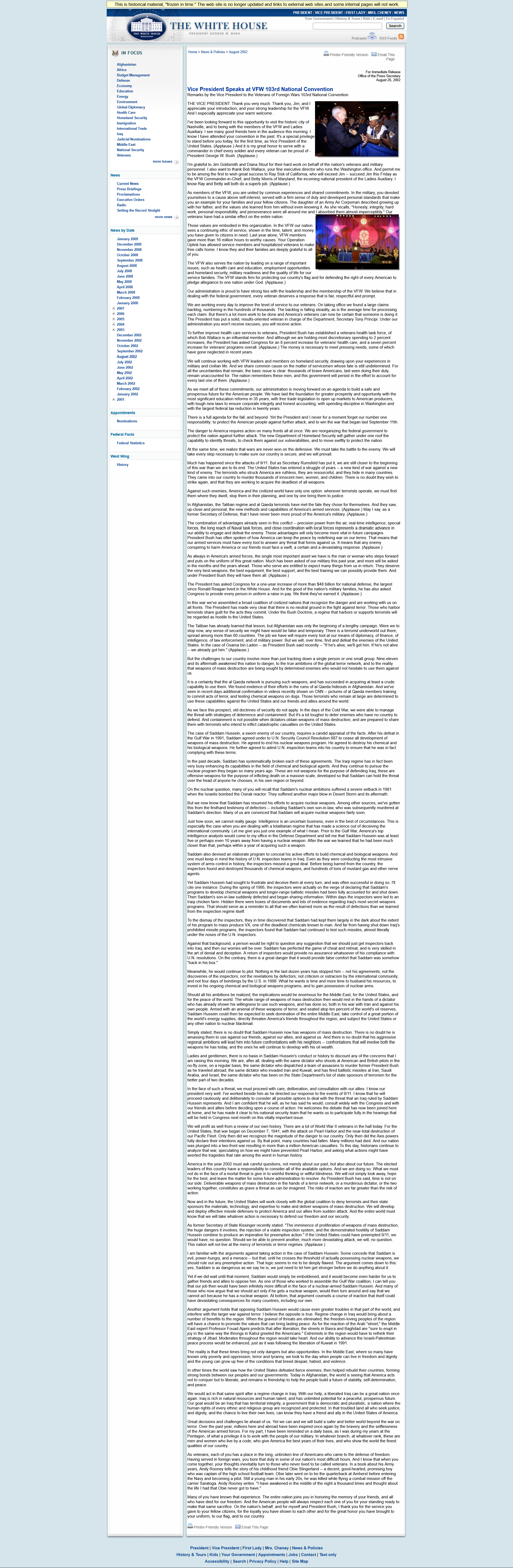 In 2002 US Vice President Dick Cheney said:Simply stated, there is no doubt that Saddam Hussein now has weapons of mass destruction.** In his infamous remarks to the UN Security Council US Secretary of State Colin Powell stated:The facts and Iraq's behavior show that Saddam Hussein and his regime are concealing their efforts to produce more weapons of mass destruction.**