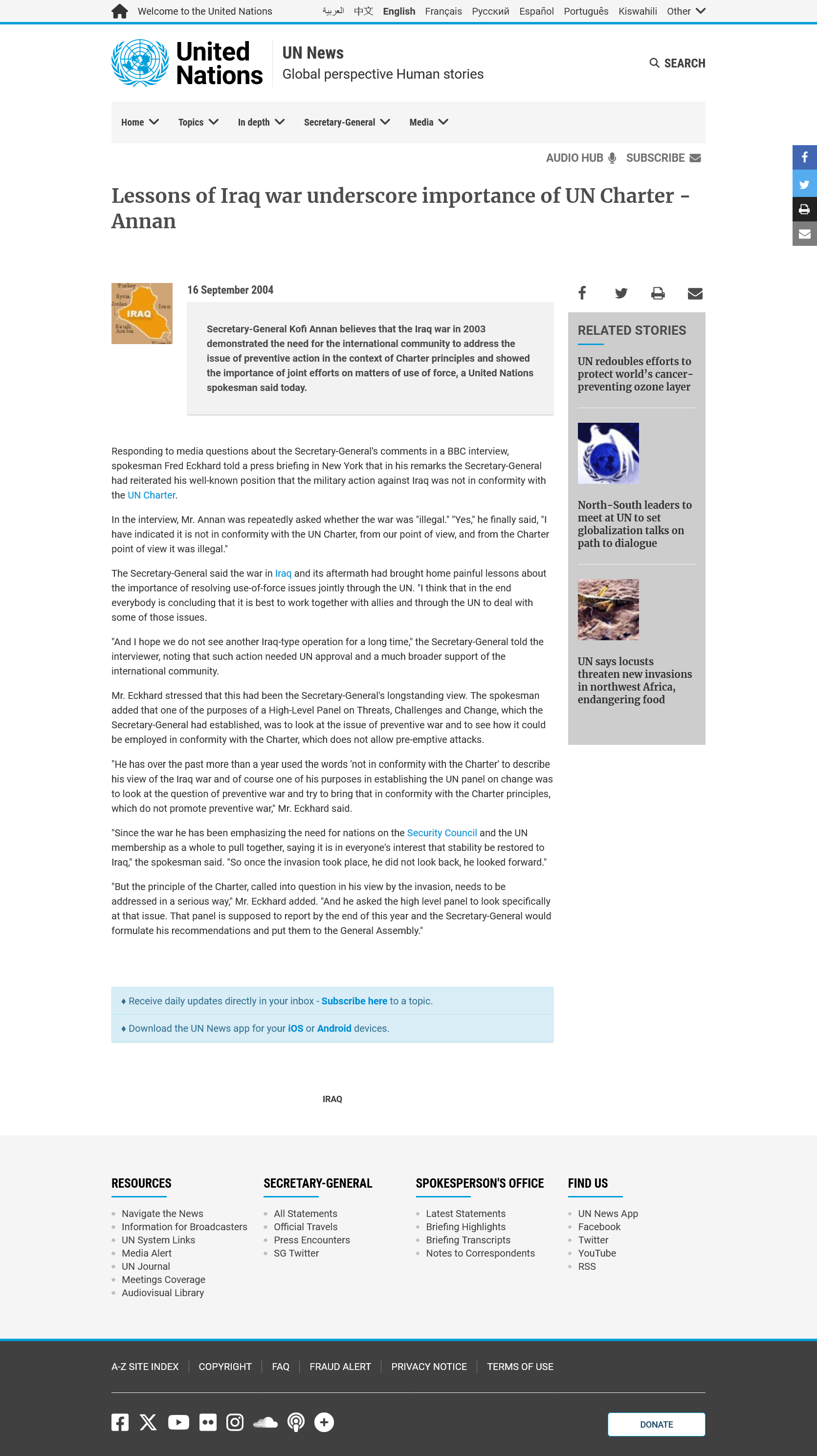 Many legal experts now describe the US-UK attack as an act of aggression, violating international law.* One study concluded that the use of military force by the Bush Administration against the regime of Saddam Hussein does not meet the ethical criteria for "preemptive war" set forth in the classical Just War tradition. In September 2004 even UN Secretary-General Kofi Annan, when asked whether the war was illegal, said:Yes, I have indicated it is not in conformity with the UN Charter, from our point of view, and from the Charter point of view it was illegal.**