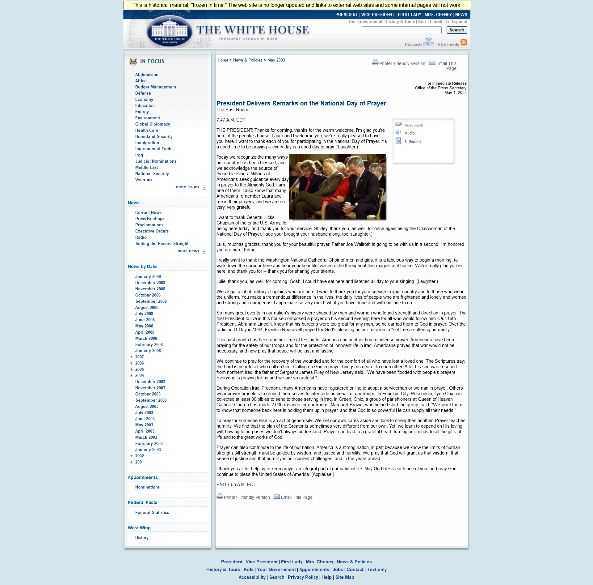 In the morning of 1 May 2003 president George W. Bush bowed his head in prayer, and said:Today we recognize the many ways our country has been blessed, and we acknowledge the source of those blessings. Millions of Americans seek guidance every day in prayer to the Almighty God. I am one of them.** In the evening of that same day he speeched from the USS Abraham Lincoln off the Coast of San Diego, California:In the battle of Iraq, the United States and our allies have prevailed. And now our coalition is engaged in securing and reconstructing that country.**