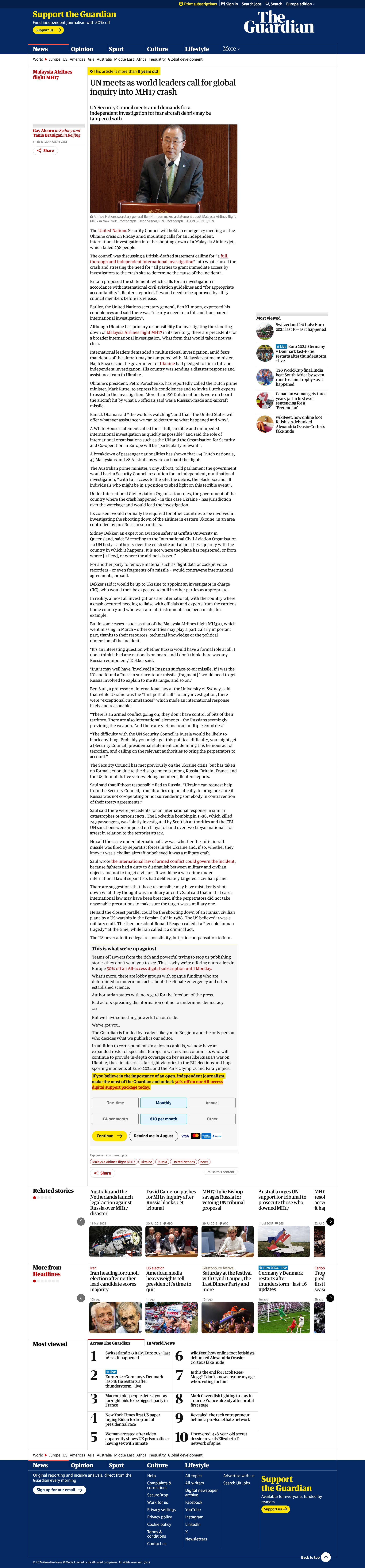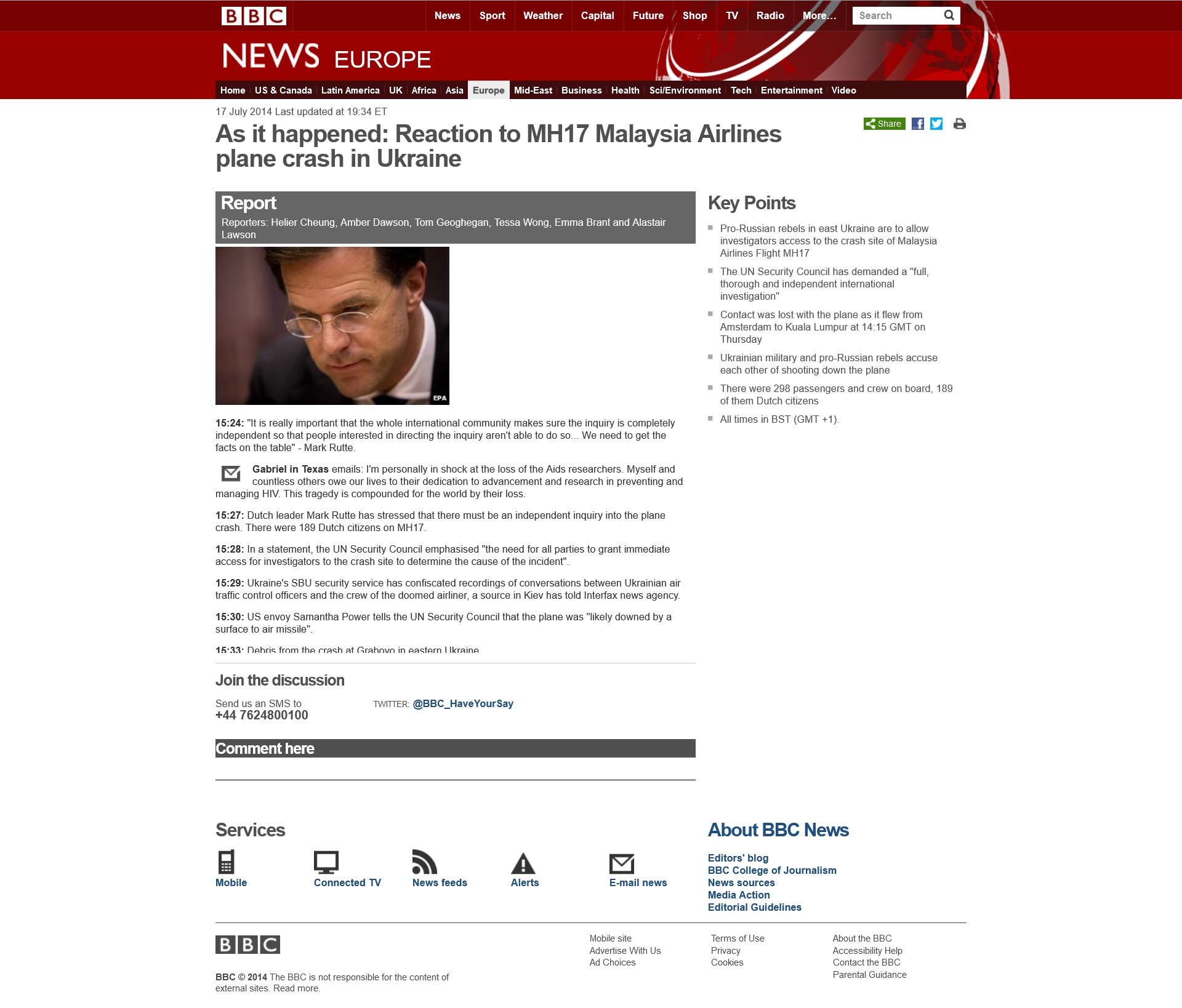 The last couple of days we have received very disturbing reports of bodies being moved about and looted for their possessions. Just imagine for one minute, not as representatives of your countries, but as fathers and mothers, just imagine that one day you lose your loved one and then two or three days later see some thug steal their wedding ring from their remains. To my dying day I will not understand that it took so much time for the rescue workers to be allowed to do their difficult jobs and that human remains should be used in a political game. I hope the world will not have to witness this again, any time in the future. Images of children's toys being tossed around, luggage being opened or passports, including passports of children being shown, are turning our grief and mourning into anger. We demand unimpeded access to the terrain. We demand respectful treatment of the crash site. We demand dignity for the victims and the multitudes who mourn their loss.
