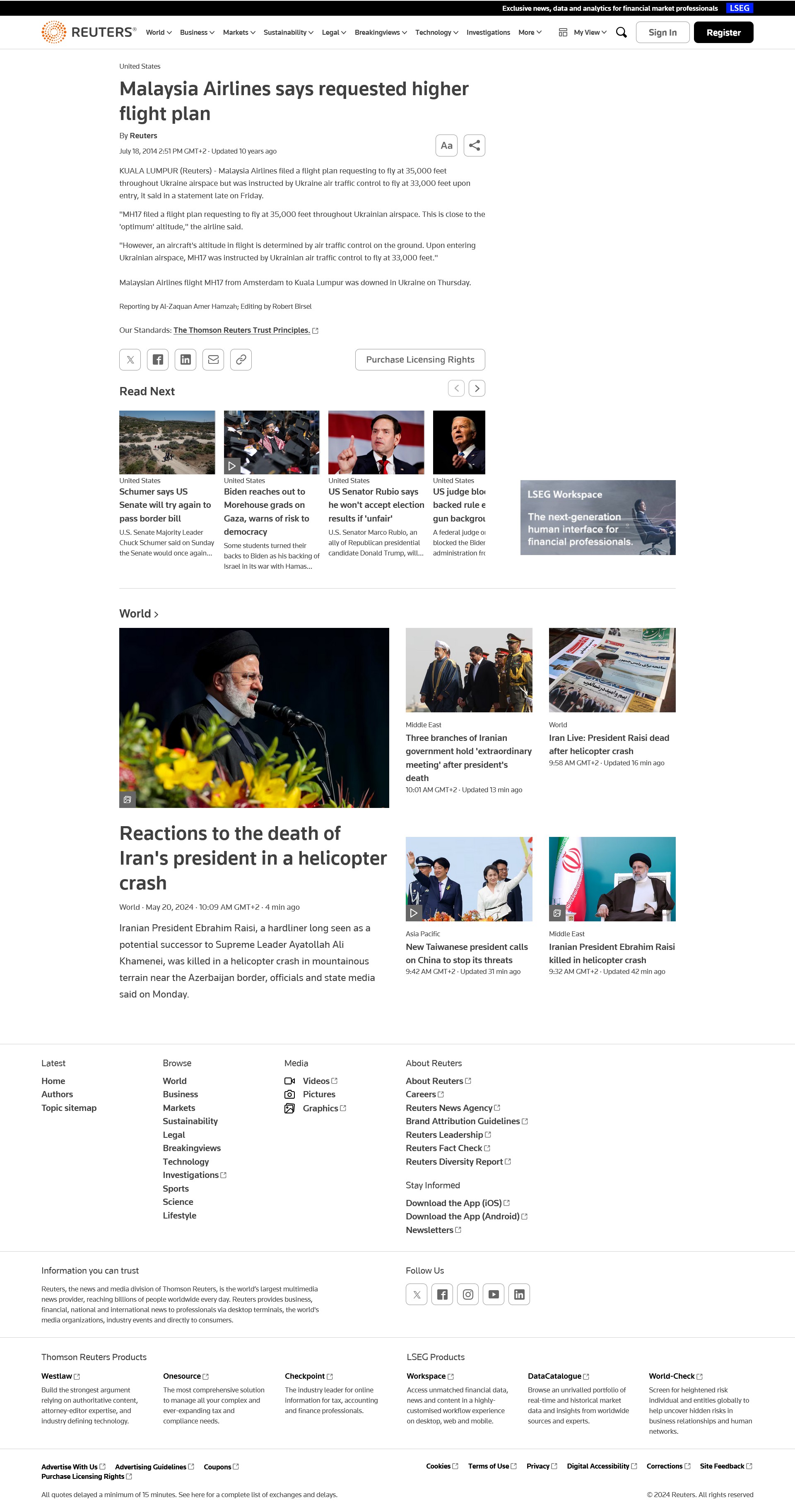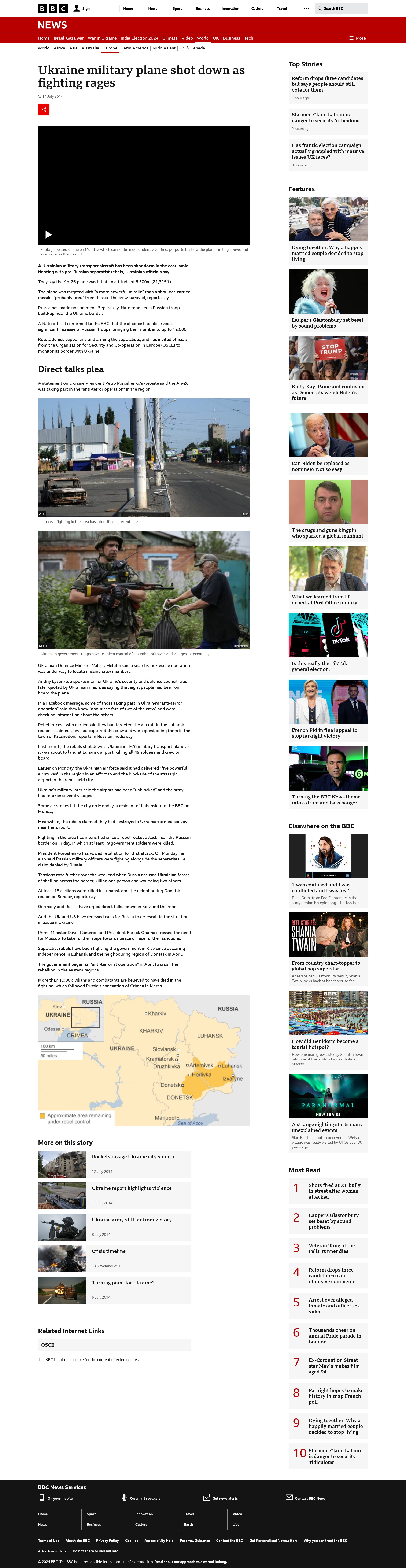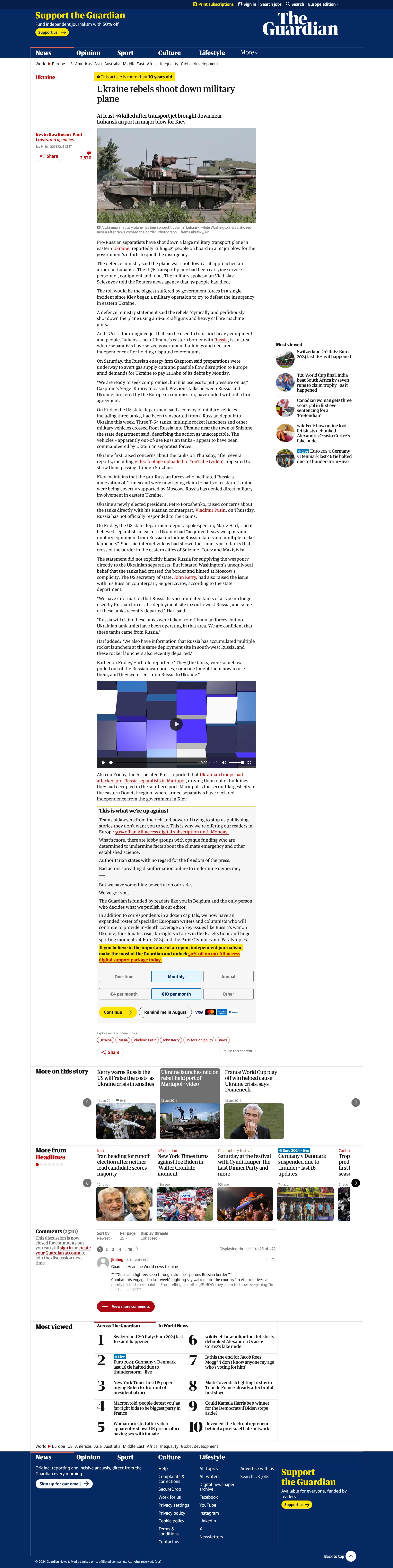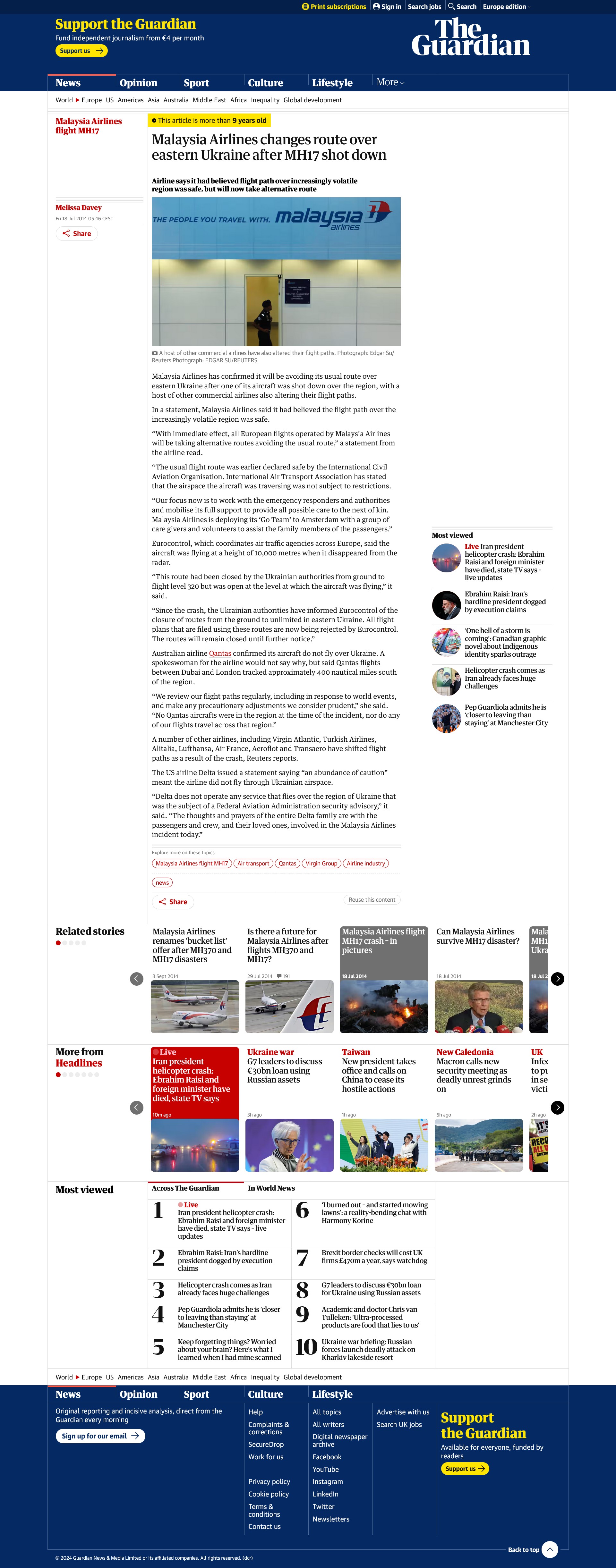 The Guardian:Eurocontrol, which coordinates air traffic agencies across Europe, said the aircraft was flying at a height of 10,000 metres [~33,000 feet] when it disappeared from the radar. “This route had been closed by the Ukrainian authorities from ground to flight level 320 [32,000 feet] but was open at the level at which the aircraft was flying,” it said.**