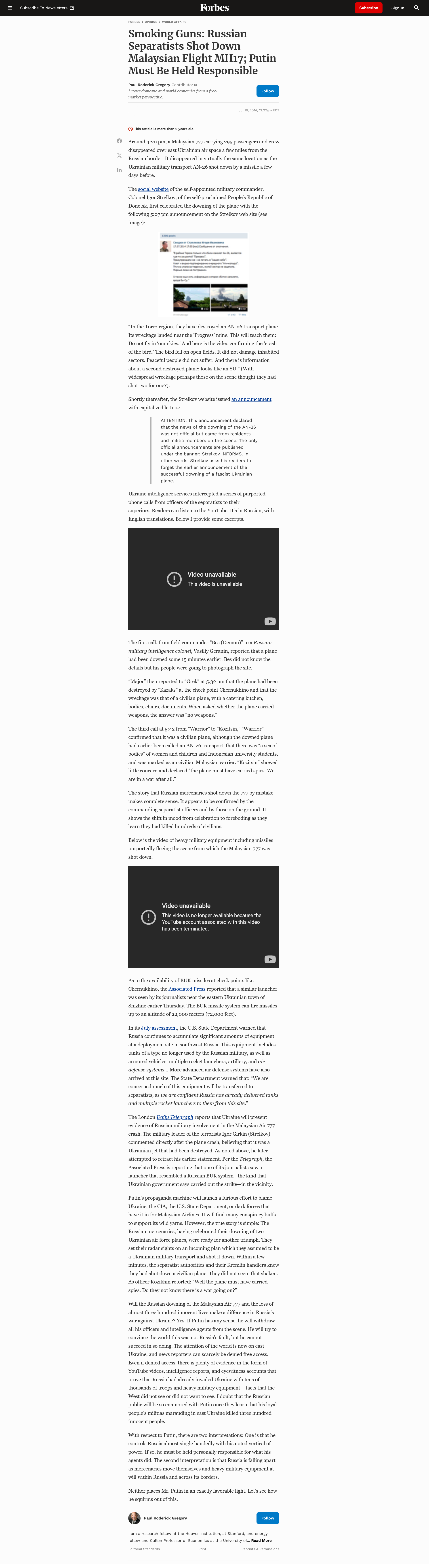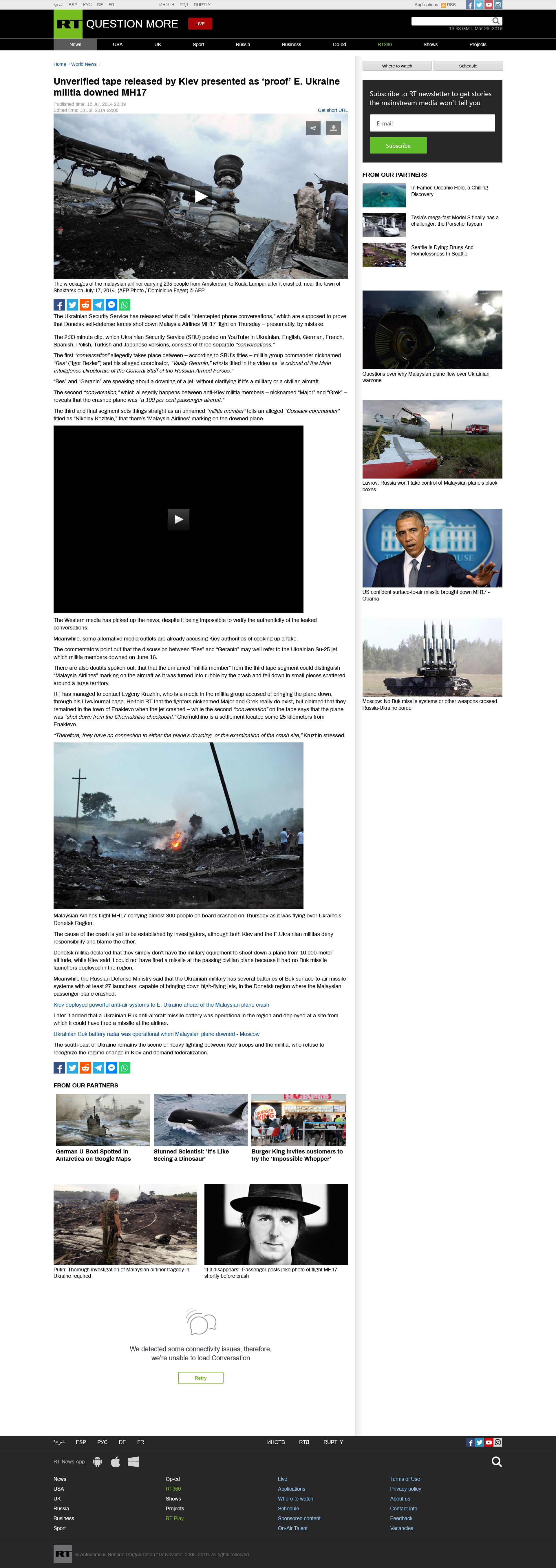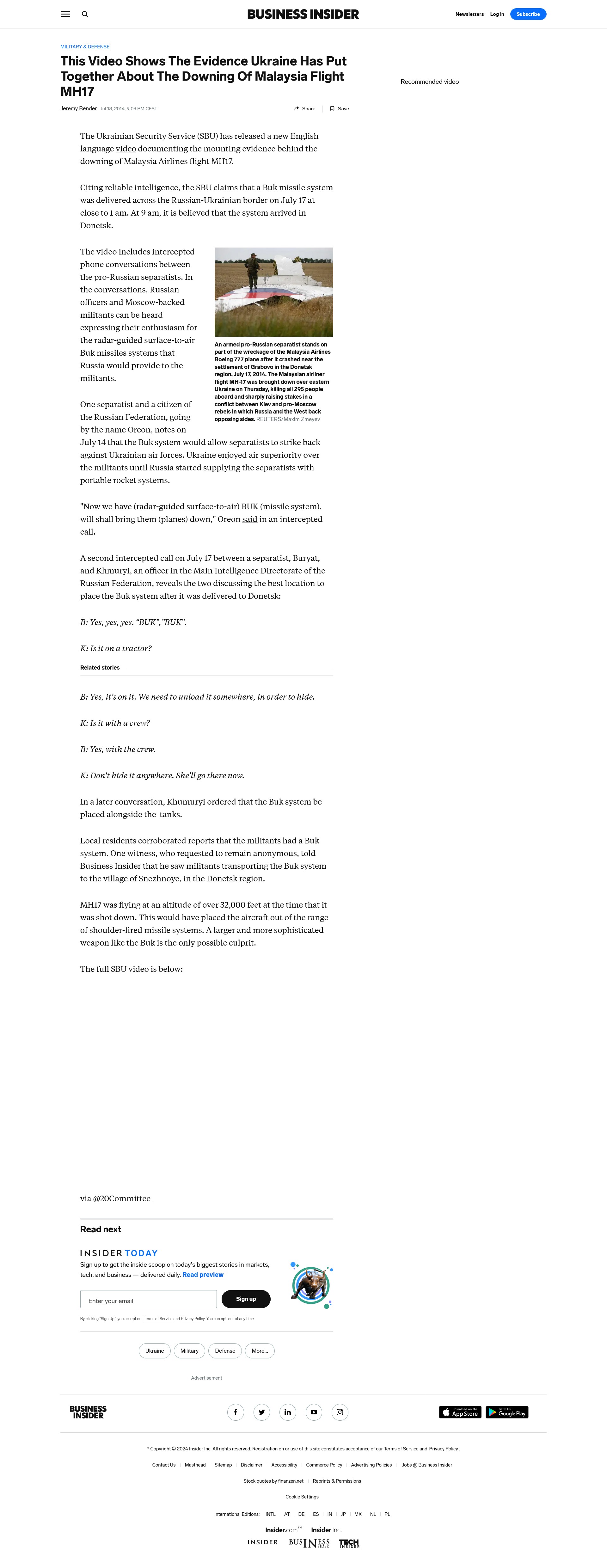 The YouTube channel on which this video appears was created on 7 April 2014, at the time of the Ukrainian Crisis, and has a link to the official SBU homepage. The western media eagerly took this video as evidence without question. Forbes headlined: Smoking Guns: Russian Separatists Shot Down Malaysian Flight MH17; Putin Must Be Held Responsible ** and Business Insider: This Video Shows The Evidence Ukraine Has Put Together About The Downing Of Malaysia Flight MH17 **. However, audio analysts easily showed that the video was a fabrication of the SBU.* It consists of three separate conversations*, as also mentioned by RT*, the Russian news outlet which was later banned by these so-called democratic western governments.